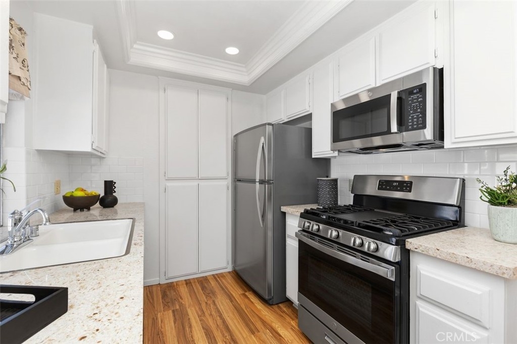 This beautiful end-unit condo is nestled in the highly desirable Fairmont Hill community. Featuring three bedrooms, two bathrooms, a dedicated laundry room, and rare two-car attached garage. Natural light pours into the open living area through an abundance of windows on three sides, along with a large sliding glass door, creating a bright and inviting atmosphere. The upgraded galley kitchen includes granite counters, stainless steel appliances and recessed lighting, ideal for modern living. The spacious primary bedroom enjoys a large walk-in closet and ensuite bath, providing a serene retreat. All living areas are on one level with the garage situated just below, so no others live above or below. Enjoy the delightful, oversized balcony for al fresco dining or relaxation. HOA amenities include two sparkling pools, spas, playground area, clubhouse, sport courts, trash service, and internet/cable. Ideally situated near the 91 Freeway, Yorba Linda Town Center, and Savi Ranch, offering easy access to shopping, dining, and entertainment. Outdoor enthusiasts will love the proximity to Yorba Regional Park. Additionally, Fairmont Hill is FHA approved, making it an excellent opportunity for first-time homebuyers. Come experience the Yorba Linda lifestyle today!