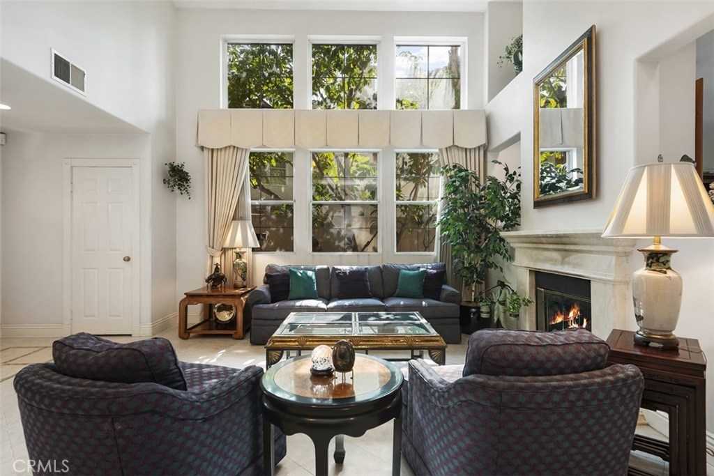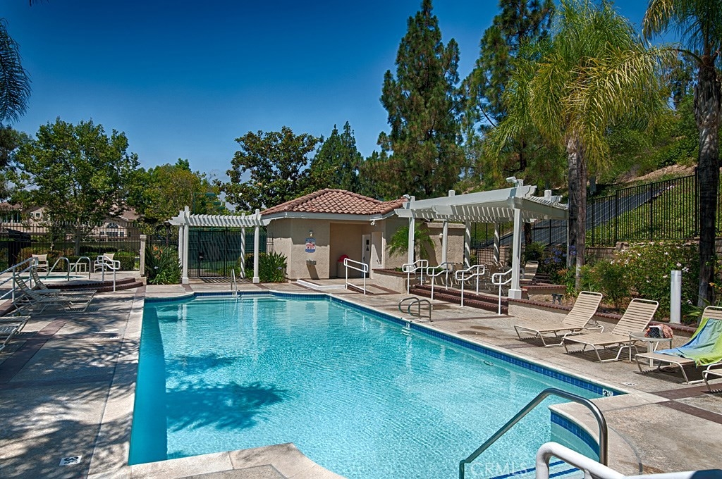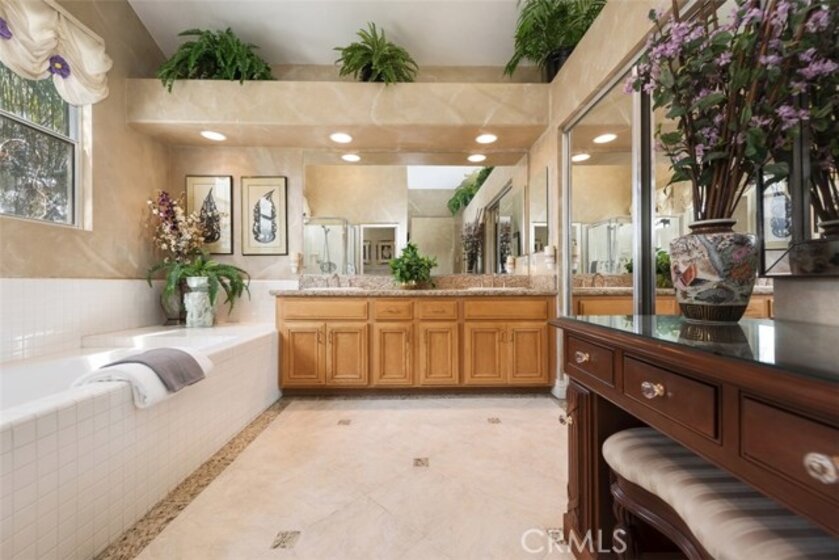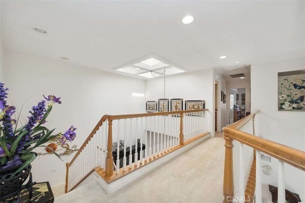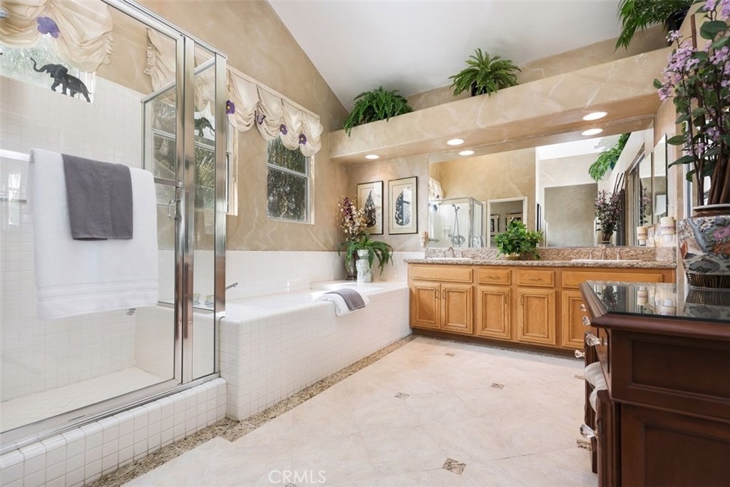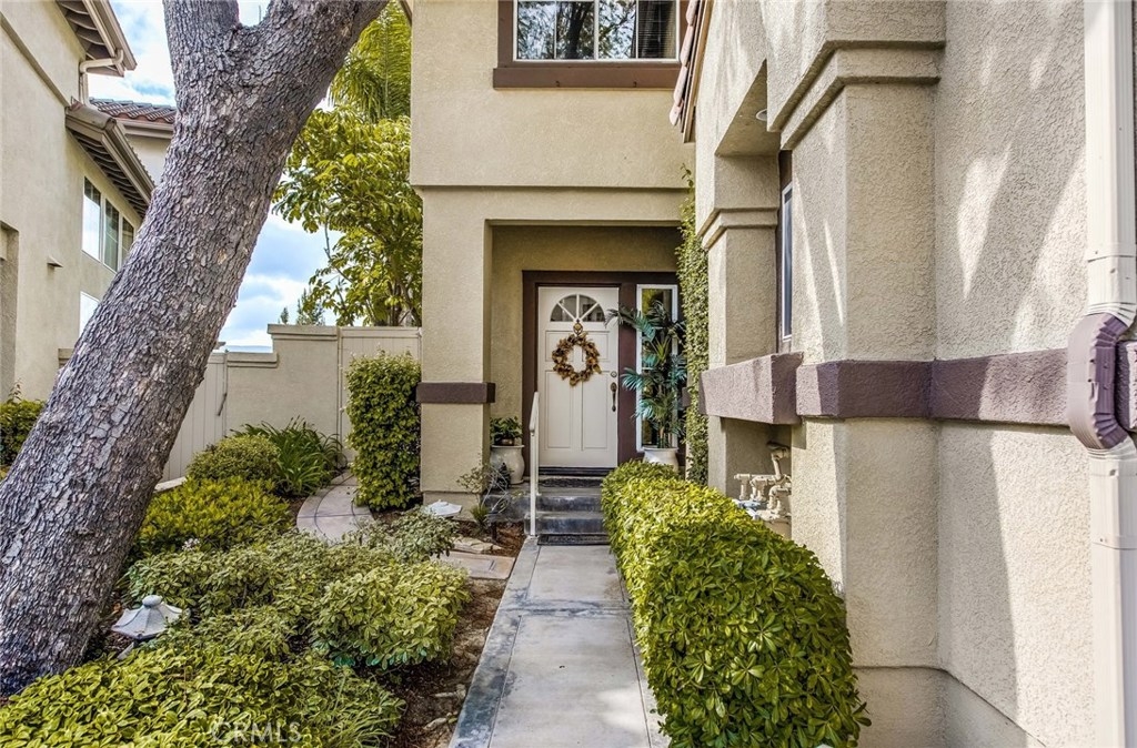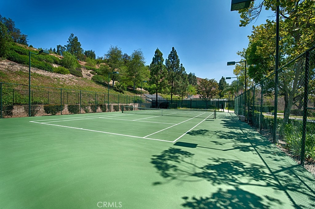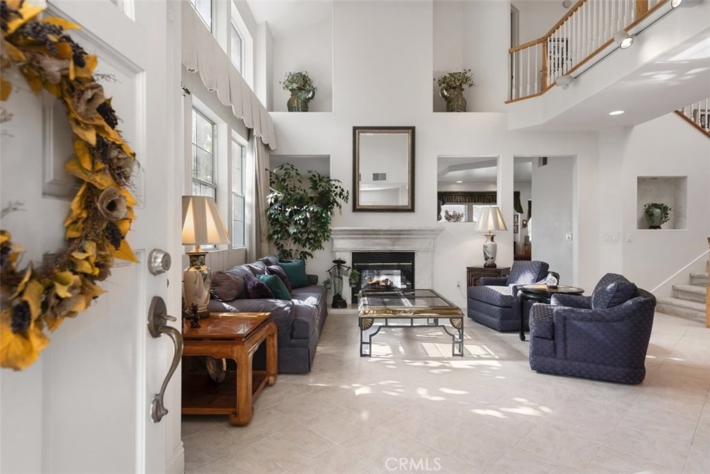 Sophisticated architecturally beautiful 4 bedroom, 2 1/2 bath home located in the La Terraza community in the hills of Yorba Linda. Fabulous views of hills & valley from family room, kitchen & master bedrooms. Elegant living room with stunning two story ceiling, multiple windows, recessed lighting & dual fireplace. Adjacent formal dining room with skylight & gorgeous chandelier. Tile floors throughout the downstairs with inlaid granite near the front door & in front of fireplace in the family room. Open & inviting kitchen with granite counter tops, large island & good sized walk-in pantry. Family room is adjacent to the kitchen with see through fireplace, ceiling fan, & built in cabinets with glass doors on both sides of fireplace for displaying your favorite things. French doors lead to patio & allow for a stunning view of the hills and lights. Master bedroom is spacious & boasts high ceilings with ceiling fan & large walk-in closet. Large master bathroom includes deep soaking tub, separate glass shower enclosure, dual sinks, granite counters & tile floors with. 3 more upstairs bedrooms & additional hall bathroom which includes dual sinks, tub and shower. Downstairs laundry room with additional storage closet. Relaxing back yard patio offers views of the hills, valley & evening lights. Assoc. amenities include 2 pools, 2 spas, sport court & tennis court. Award winning Placentia Yorba Linda School District. MATERPORT VIRTUAL TOUR BELOW MAP, it is labeled VT with a camera.