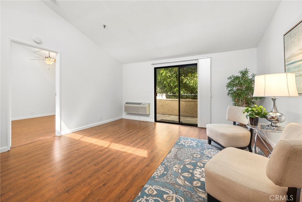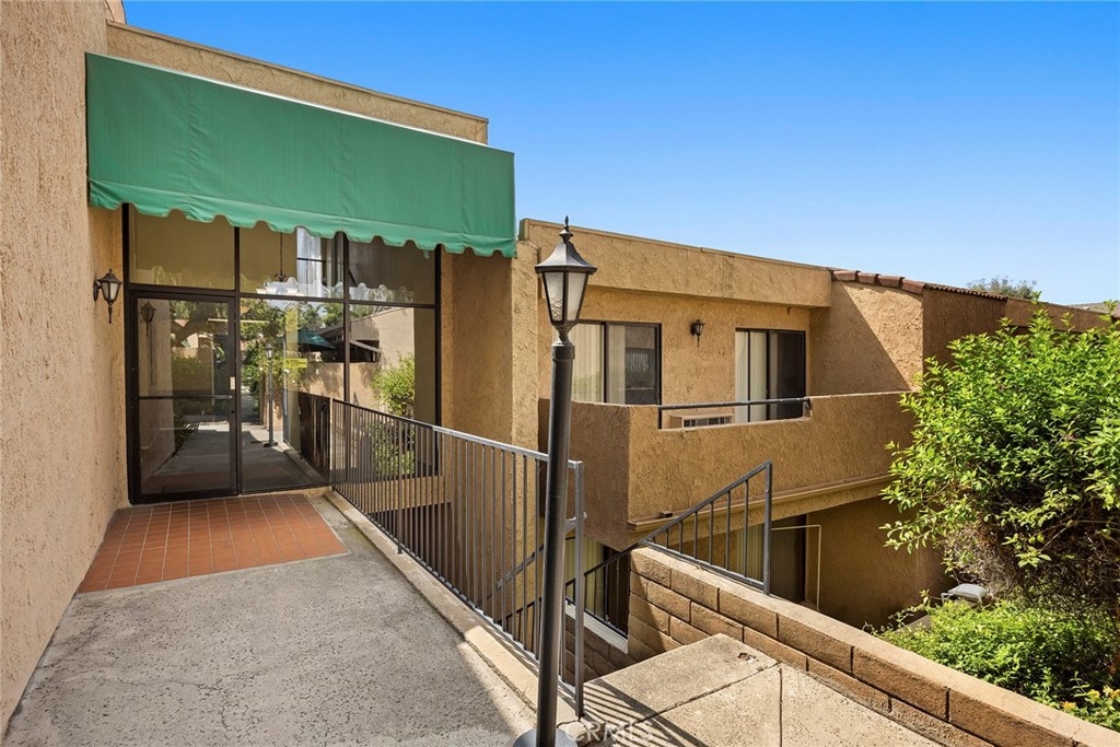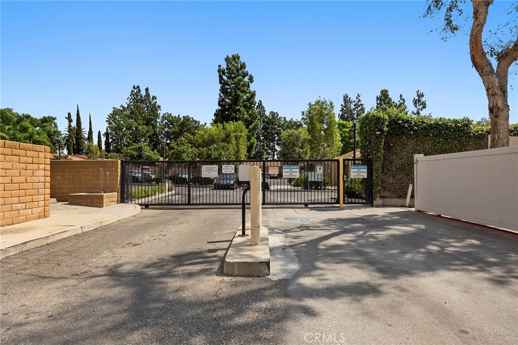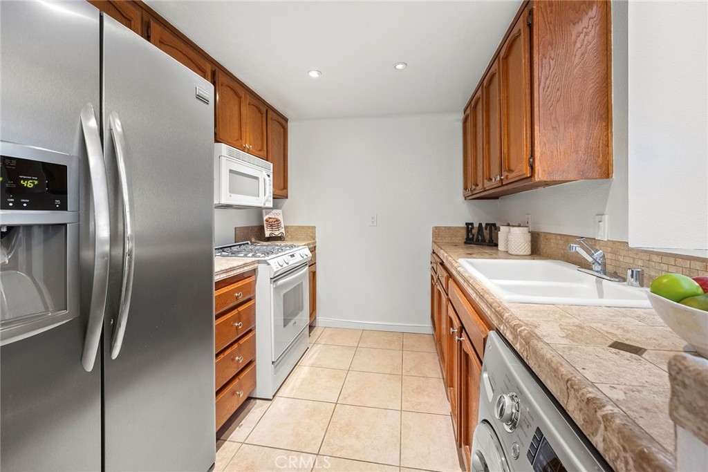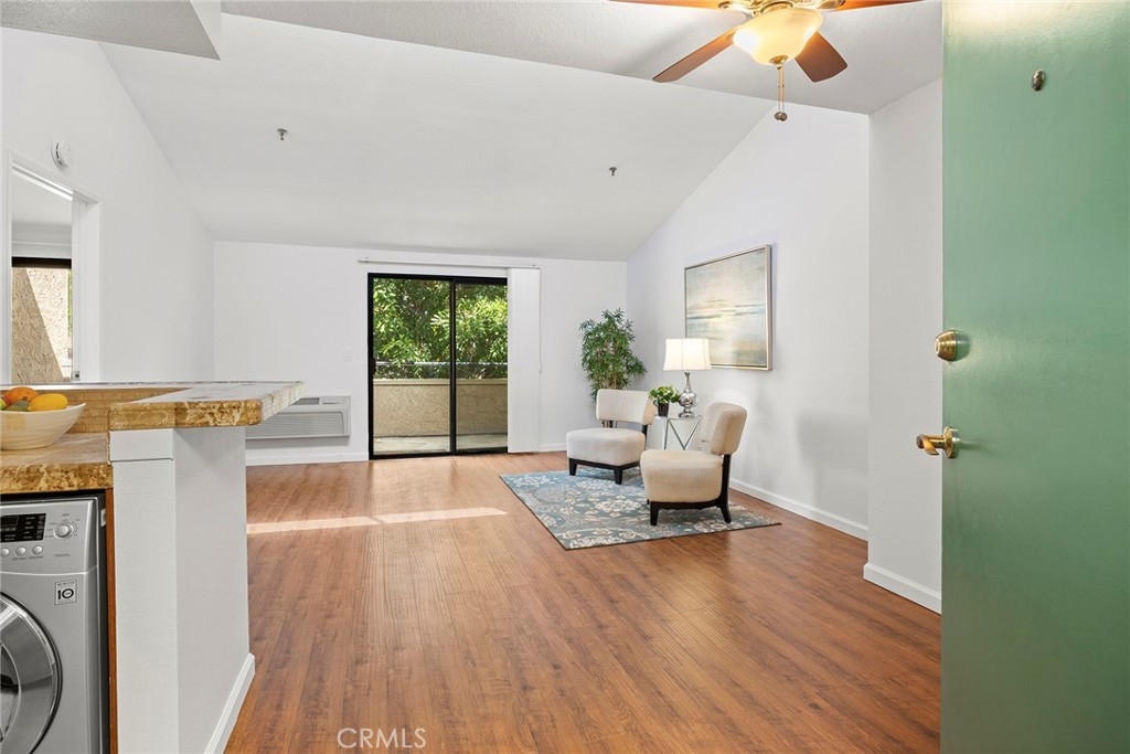 Welcome to this beautifully maintained upper end-unit nestled in a lushly landscaped, gated 55+ community. Enjoy serene greenbelt views from your spacious private balcony. Inside, the bright and airy living area features soaring cathedral ceilings with high accent windows that let in an abundance of natural light. The open-concept layout includes a dining area with a handy storage closet or pantry, and a well-equipped kitchen featuring a gas range, built-in microwave, refrigerator, and even a Samsung all-in-one washer/dryer combo—perfect for everyday laundry needs. For larger loads, a shared laundry room is conveniently located just one floor below. The inviting bedroom offers direct access to the balcony through a sliding glass door, along with both a walk-in and wardrobe closet for ample storage. The full bathroom includes built-in linen storage for added convenience. Community amenities include a spacious recreation room complete with a full kitchen, cozy fireplace, card tables, and a peaceful reading lounge. Residents also enjoy regular social events like monthly potlucks—fostering a warm, friendly atmosphere. Located just across the street from the vibrant Yorba Linda Town Center, you'll have easy access to shopping, dining, entertainment and a local coffee shop are just down the road. This isn’t just a place to live—it’s a great community to be part of. Come take a look and see if it feels like home!