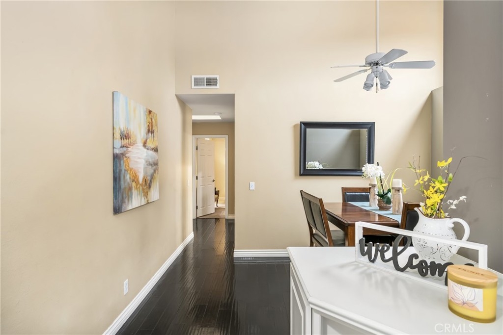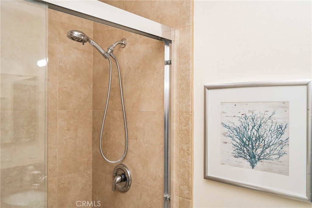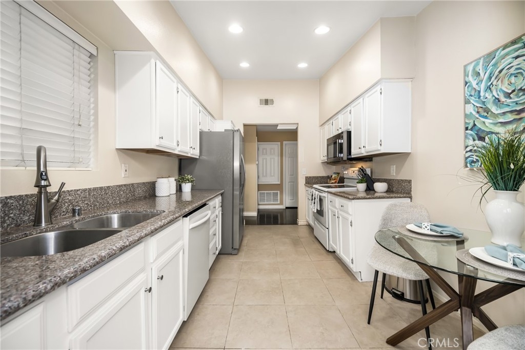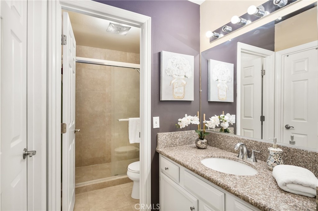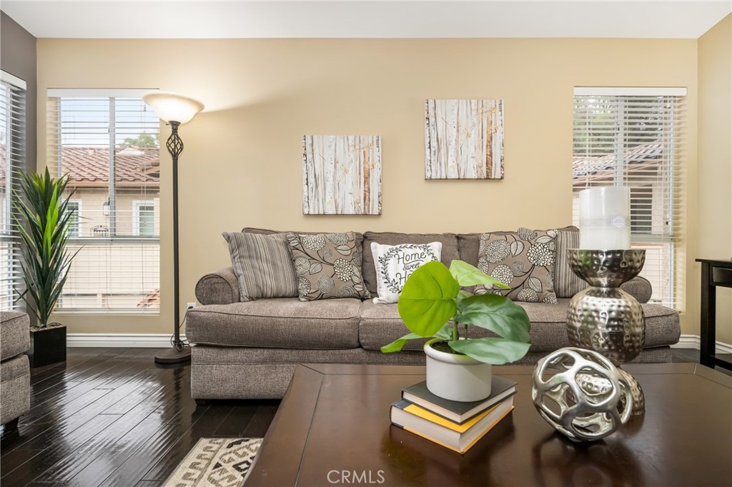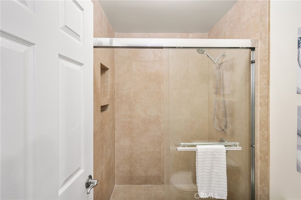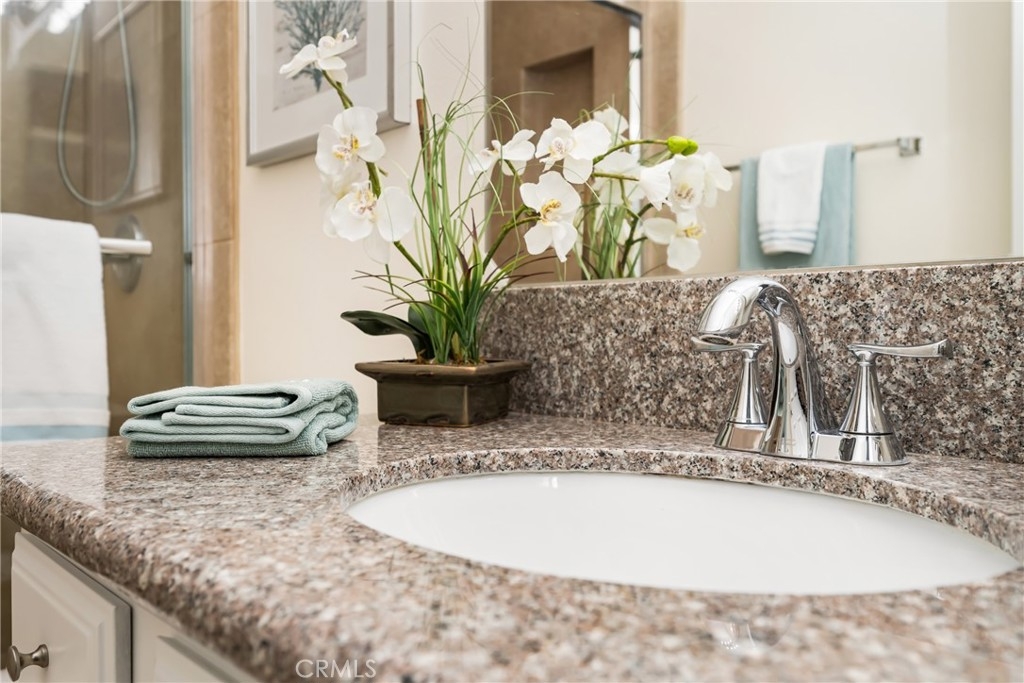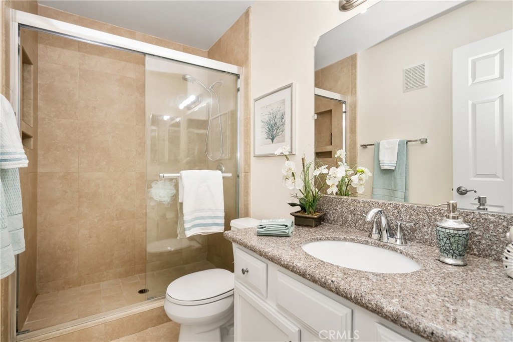 Welcome to your private enclave at the “Hills”! This beautifully improved two bedroom, two bath upstairs condominium is perfectly tucked away among the breathtaking hills of Yorba Linda yet still conveniently close to it all. The impressive wrap around patio welcomes you inside to discover a warm yet dramatic entry with vaulted ceilings, plentiful light, custom cabinetry, elegant hard wood flooring and a cozy custom mantled fireplace. Just adjacent is the dining room and kitchen with classic white cabinetry, stainless steel dual sink with new faucet and disposal, granite counter tops, and recessed lighting. There is one of three sliders to the patio just off the kitchen which provides terrific access for indoor/outdoor entertaining. Head toward the spacious primary suite featuring vaulted ceilings, a walk in closet, patio access and a pristine en-suite bath with single sink vanity with granite counters, tile flooring and a custom glass enclosed walk in shower. The additional guest bedroom also enjoys vaulted ceilings, a walk in closet and guest bath just off the hall with single vanity and tiled walk in shower. This unit additionally features a utility closet for extra storage, a newer washer and dryer, custom blinds and two assigned covered parking spaces. This neighborhood offers fabulous amenities including a community pool, spa, gym and clubhouse for social activities, playground, tennis courts and is walking distance to trails and Box Canyon Park. Water and trash is included with the HOA as well! Zoned for prestigious schools including Yorba Linda High School and within close proximity to local shops, entertainment and the 91 and 241 freeway make this home an incredible opportunity not to be missed!
