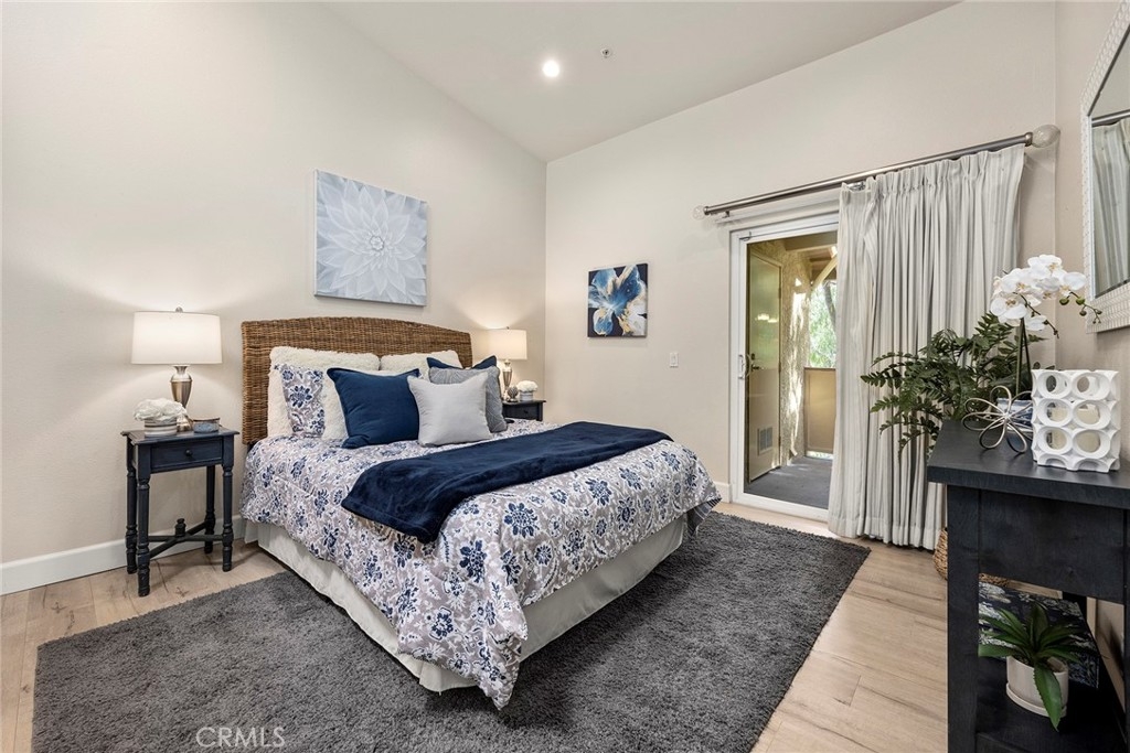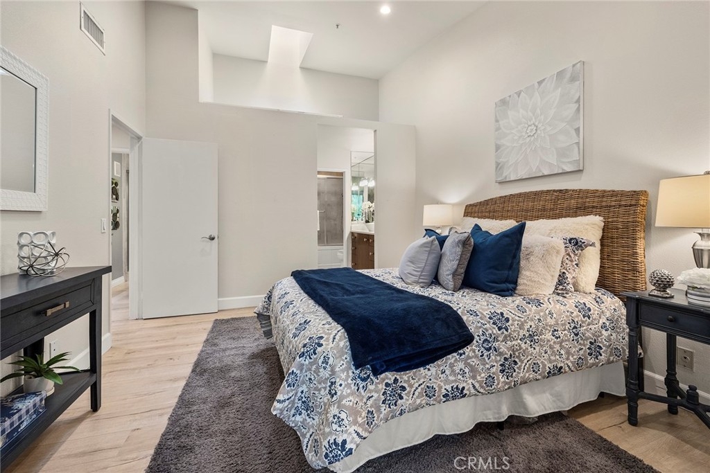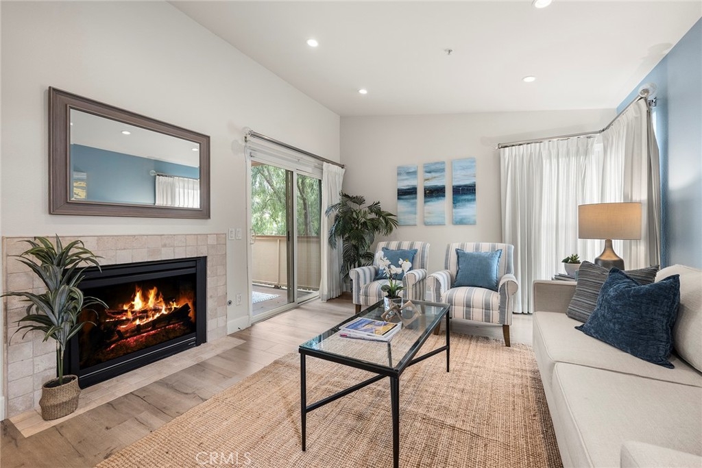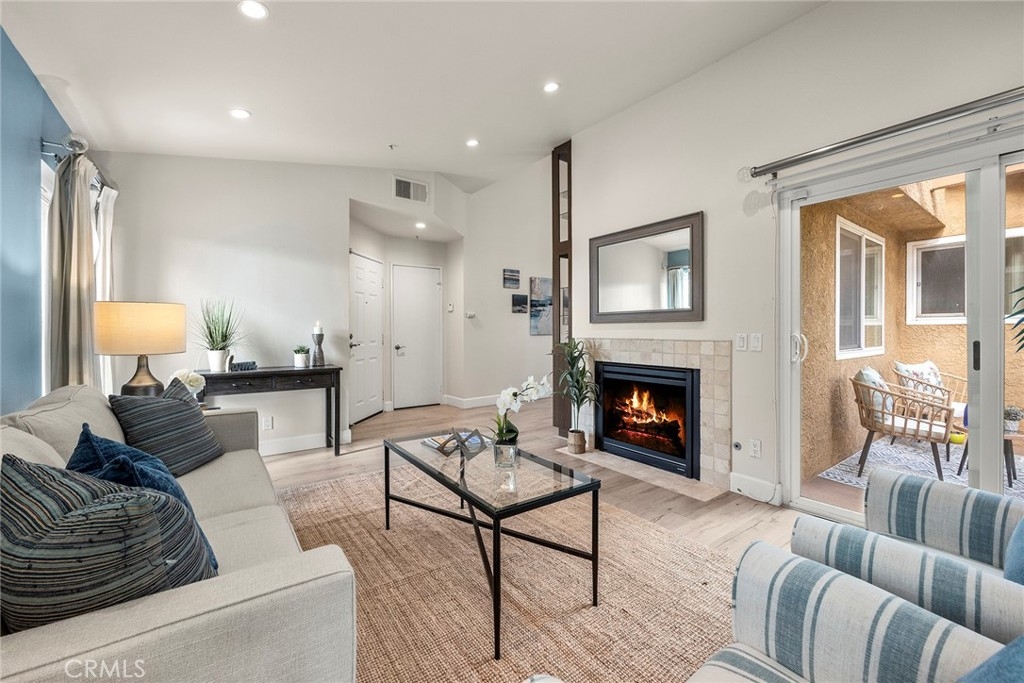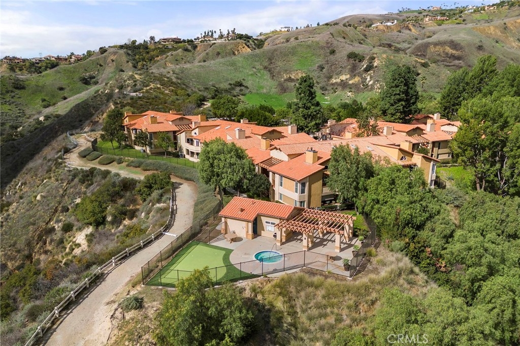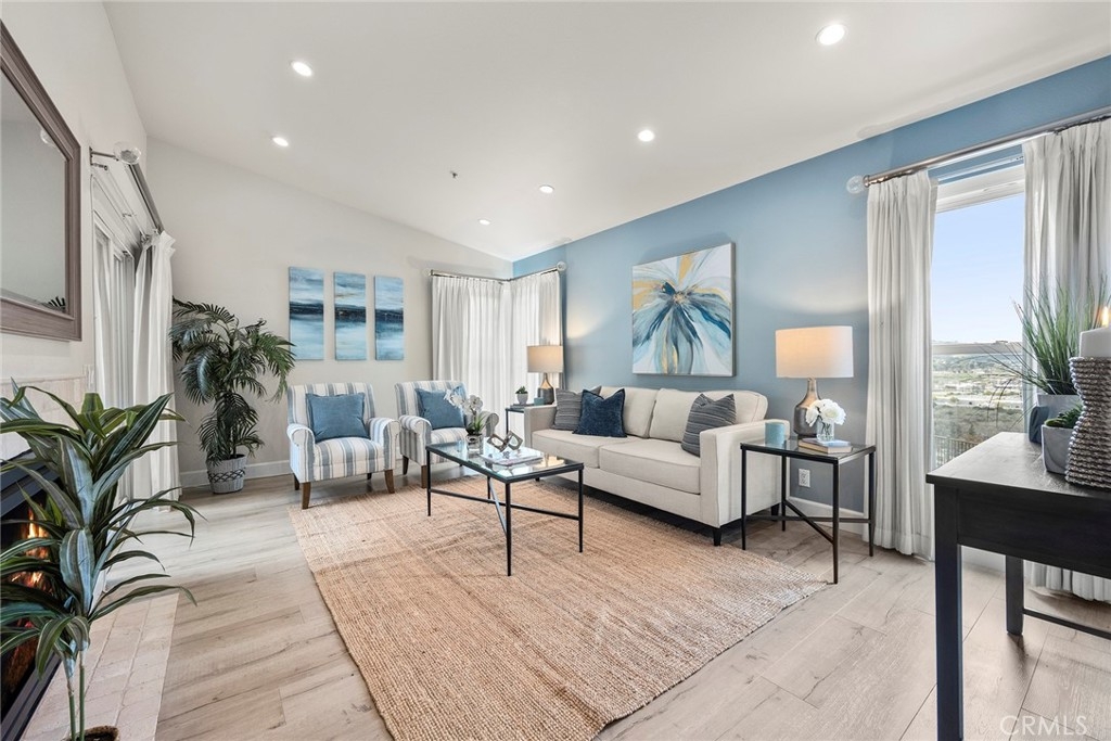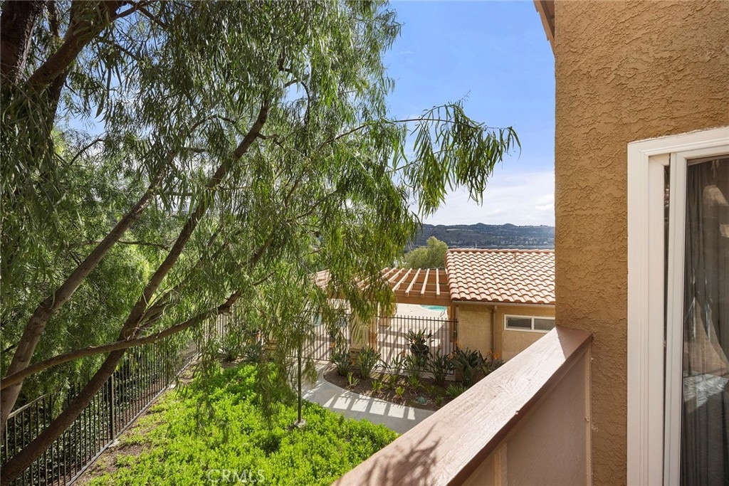 Located in “The Hills” development off of La Palma in Yorba Linda and with a view; this is the unit you will want to see before you make any other decision. The unit has been remodeled. The kitchen and baths all have quartz countertops and newer custom Hawaiian wood cabinetry. Lighting was remodeled and laminate flooring is throughout. The upstairs unit is very private with city light and hills views from the front windows and the balcony. It has a very serene feel. In addition the kitchen as a GE Profile stove with oven and an raised microwave above. Also, enjoy the wine cooler. You can exit the kitchen out to the balcony as you can also do from the primary bedroom and the living room. Raised ceilings are in most rooms to give you a great sense of spaciousness. There is a dining room and an open living room with a fireplace. Two bedrooms, the front bedroom is quite large and has a walk-in closet. The hall ¾ bath services this bedroom and your guests. Finally, the primary bedroom has vaulted ceilings and the slider to the balcony. The master bath is a full bath that was remodeled and has a walk-in closet with organizers. Outside on the balcony is a large closet area for the laundry and other items for storage. The heater and AC are newer. There is good space on the balcony for outside dinners or relaxing. A second closet is located near the front door for additional storage. Just outside this unit is an area for residents that includes a spa, putting green and restrooms. This area also enjoys views. A near by walking trail is available as well. The amenities of The Hills community are wonderful with a fitness center, two pools, 3 spas, tennis courts and tot lots. This unit comes with two covered parking spaces.