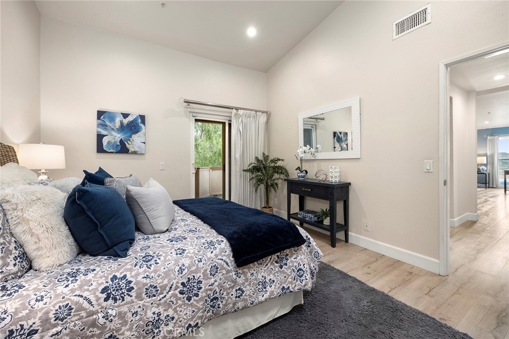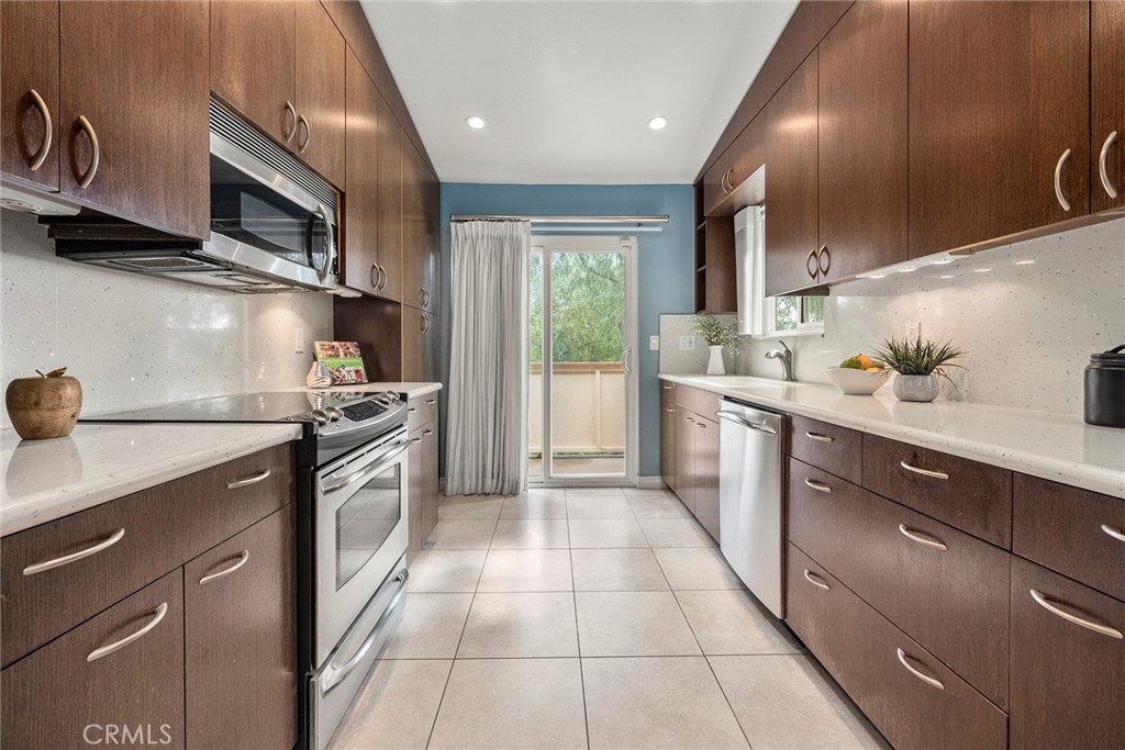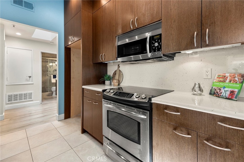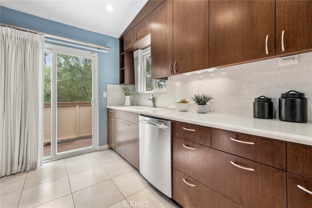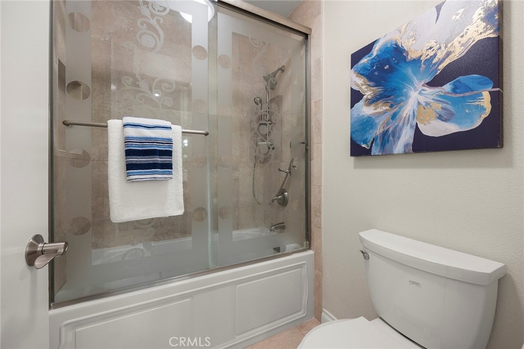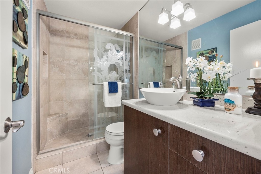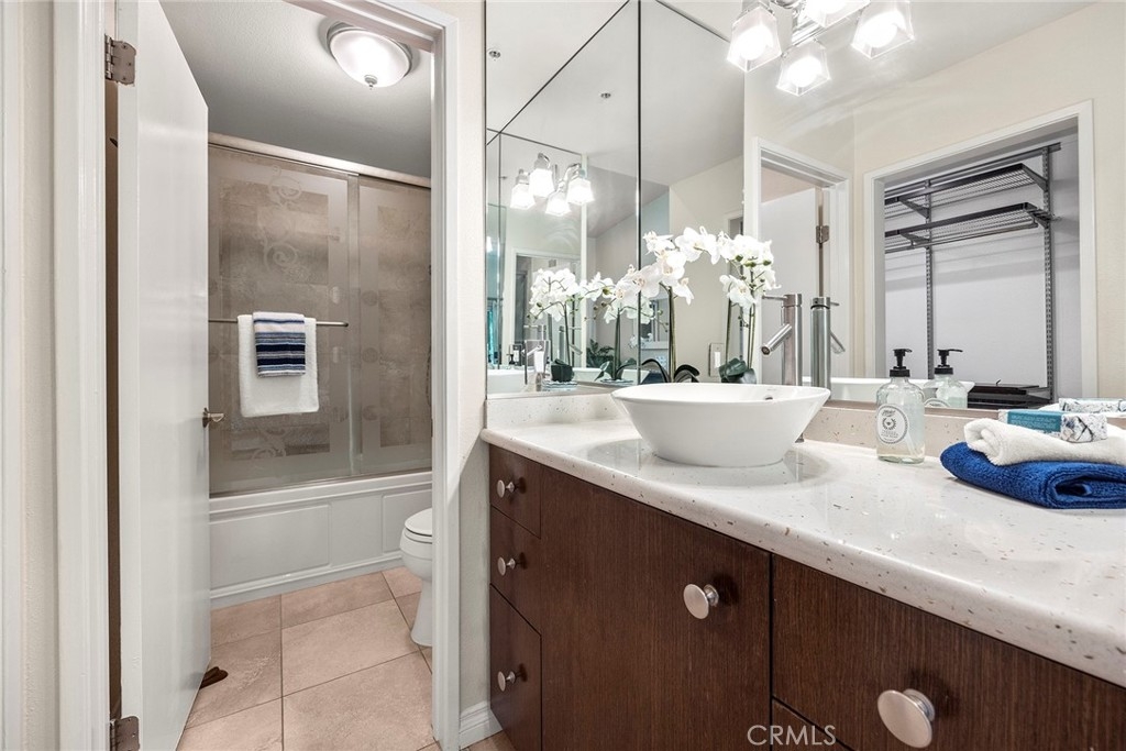 Located in “The Hills” development off of La Palma in Yorba Linda and with a view; this is the unit you will want to see before you make any other decision. The unit has been remodeled. The kitchen and baths all have quartz countertops and newer custom Hawaiian wood cabinetry. Lighting was remodeled and laminate flooring is throughout. The upstairs unit is very private with city light and hills views from the front windows and the balcony. It has a very serene feel. In addition the kitchen as a GE Profile stove with oven and an raised microwave above. Also, enjoy the wine cooler. You can exit the kitchen out to the balcony as you can also do from the primary bedroom and the living room. Raised ceilings are in most rooms to give you a great sense of spaciousness. There is a dining room and an open living room with a fireplace. Two bedrooms, the front bedroom is quite large and has a walk-in closet. The hall ¾ bath services this bedroom and your guests. Finally, the primary bedroom has vaulted ceilings and the slider to the balcony. The master bath is a full bath that was remodeled and has a walk-in closet with organizers. Outside on the balcony is a large closet area for the laundry and other items for storage. The heater and AC are newer. There is good space on the balcony for outside dinners or relaxing. A second closet is located near the front door for additional storage. Just outside this unit is an area for residents that includes a spa, putting green and restrooms. This area also enjoys views. A near by walking trail is available as well. The amenities of The Hills community are wonderful with a fitness center, two pools, 3 spas, tennis courts and tot lots. This unit comes with two covered parking spaces.