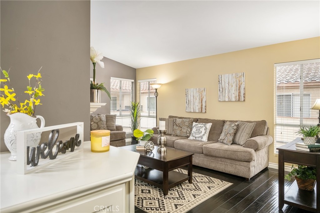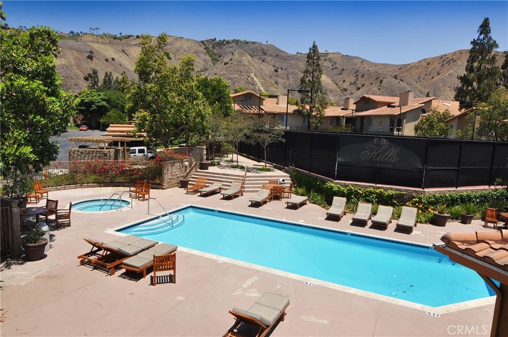Welcome to your private enclave at the “Hills”! This beautifully improved two bedroom, two bath upstairs condominium is perfectly tucked away among the breathtaking hills of Yorba Linda yet still conveniently close to it all. The impressive wrap around patio welcomes you inside to discover a warm yet dramatic entry with vaulted ceilings, plentiful light, custom cabinetry, elegant hard wood flooring and a cozy custom mantled fireplace. Just adjacent is the dining room and kitchen with classic white cabinetry, stainless steel dual sink with new faucet and disposal, granite counter tops, and recessed lighting. There is one of three sliders to the patio just off the kitchen which provides terrific access for indoor/outdoor entertaining. Head toward the spacious primary suite featuring vaulted ceilings, a walk in closet, patio access and a pristine en-suite bath with single sink vanity with granite counters, tile flooring and a custom glass enclosed walk in shower. The additional guest bedroom also enjoys vaulted ceilings, a walk in closet and guest bath just off the hall with single vanity and tiled walk in shower. This unit additionally features a utility closet for extra storage, a newer washer and dryer, custom blinds and two assigned covered parking spaces. This neighborhood offers fabulous amenities including a community pool, spa, gym and clubhouse for social activities, playground, tennis courts and is walking distance to trails and Box Canyon Park. Water and trash is included with the HOA as well! Zoned for prestigious schools including Yorba Linda High School and within close proximity to local shops, entertainment and the 91 and 241 freeway make this home an incredible opportunity not to be missed!