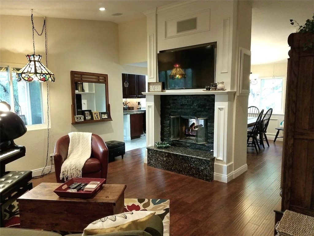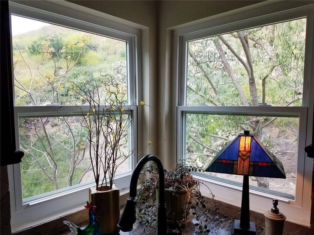Most beautiful location in The Hills. Feels like a treehouse with views from every window. From the deck, you face a greenbelt with pine trees and city lights views through the branches at night. The front steps are toward a parking lot surrounded by hills, so there is plenty of guest parking. One of the 2 assigned parking spots is right in front of the home. Being on the 2nd floor, it is quiet with vaulted ceilings, 2 recently replaced skylights, and attic space for storage. This home has been highly upgraded with granite countertops, travertine backsplash, lots of moldings including wainscotting in the dining room, recessed lighting, remodeled master bath, barn door at master walk-in closet, surround sound in the living room, laminate flooring, newer appliances, an audio cabinet, and newer windows.