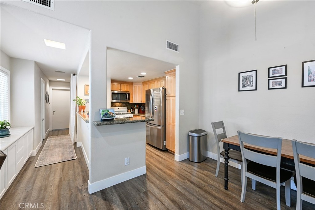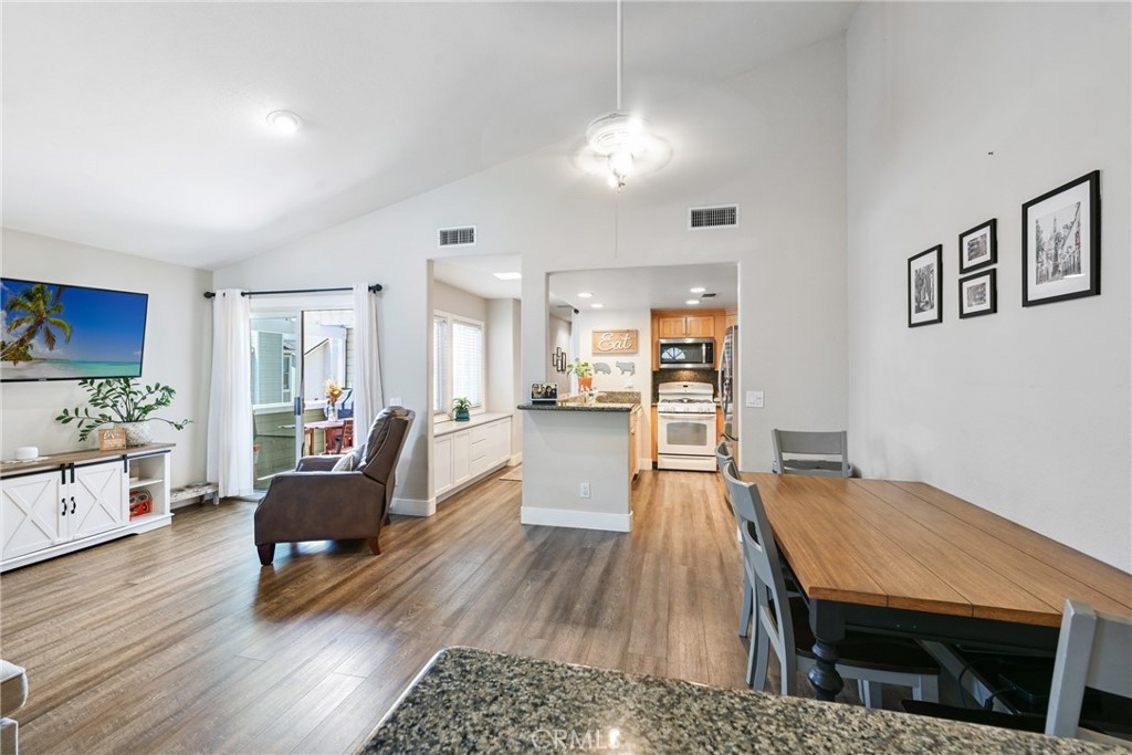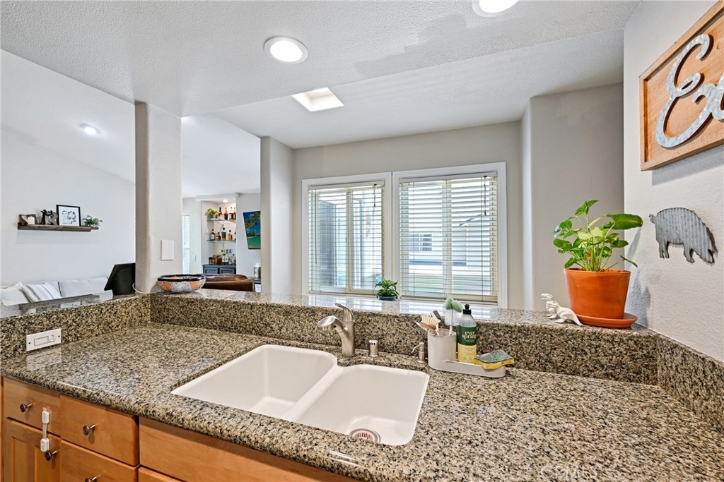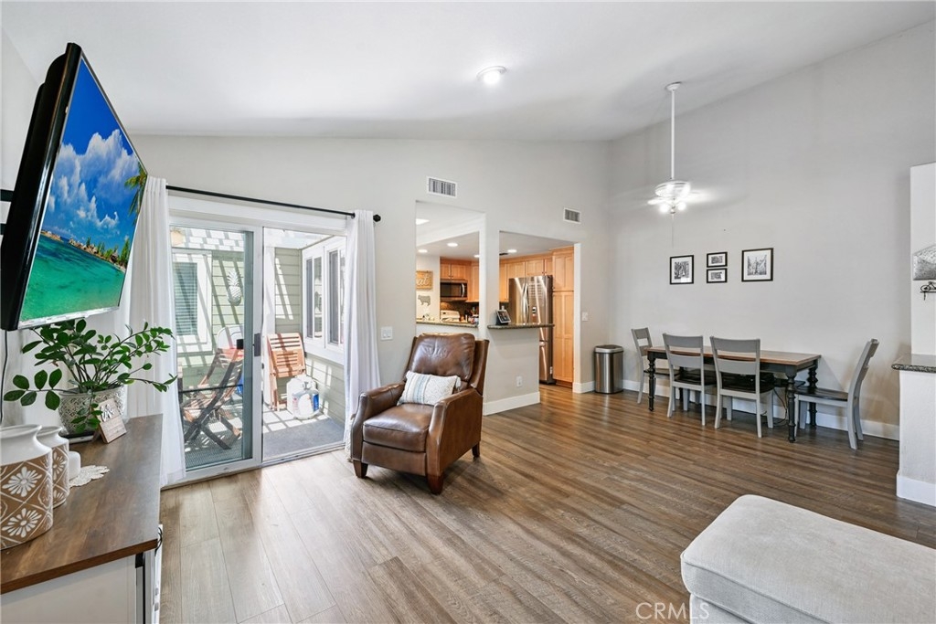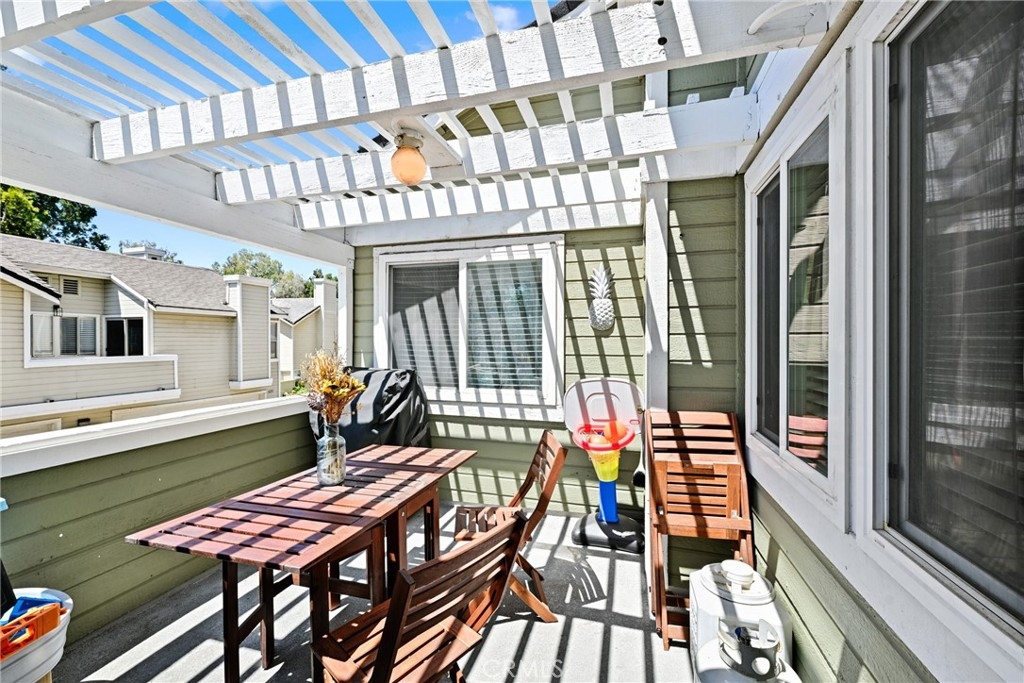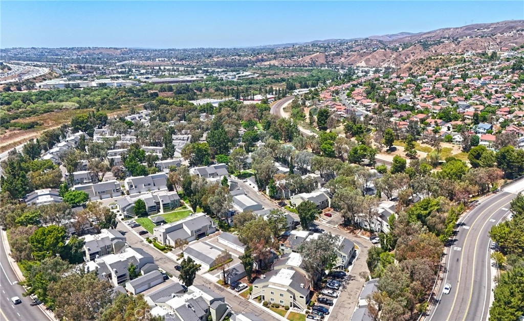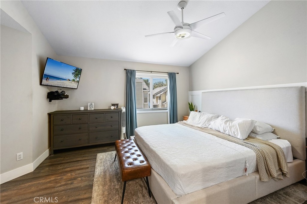 Discover the perfect blend of style and convenience in this second-floor condo at 23395 Camden Court #161, Yorba Linda. This inviting home offers a comfortable and a modern 1,013 square foot living space including 2 bedrooms and 2 bathrooms, ideal for individuals or couples seeking a low-maintenance lifestyle. Enter through a single door with glass accents, leading you into a welcoming interior. The spacious family room features luxury vinyl plank flooring, recessed lighting, a built-in bar, and vaulted ceilings with a ceiling fan, creating a versatile space for relaxation and entertainment. The well-appointed kitchen boasts granite countertops, custom cabinetry, and stainless steel appliances, including a built-in microwave and a 4 gas burner stovetop. A convenient hallway offers built-in storage along with laundry facilities. The primary bedroom is a serene retreat with vaulted ceilings, a ceiling fan, blinds, and drapes. The en-suite bathroom features a walk-in closet and a cultured marble vanity with newer fixtures and a large shower. The second bedroom is equally comfortable with recessed lighting, a ceiling fan, blinds, and drapes, while the hall bathroom offers tile flooring and a convenient shower/tub combination. Enjoy the convenience of a two-car attached garage. Step outside to your private upstairs patio, perfect for morning coffee or evening relaxation. This condo is part of a vibrant community offering a pool, spa, beach volleyball court, and dog park. Experience the best of Yorba Linda living in this modern and well-maintained condo.