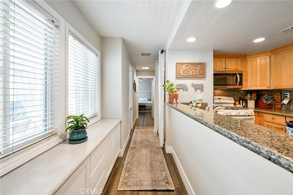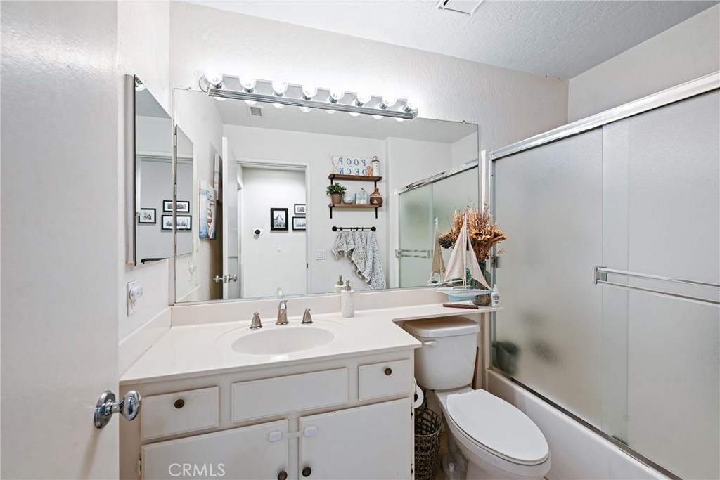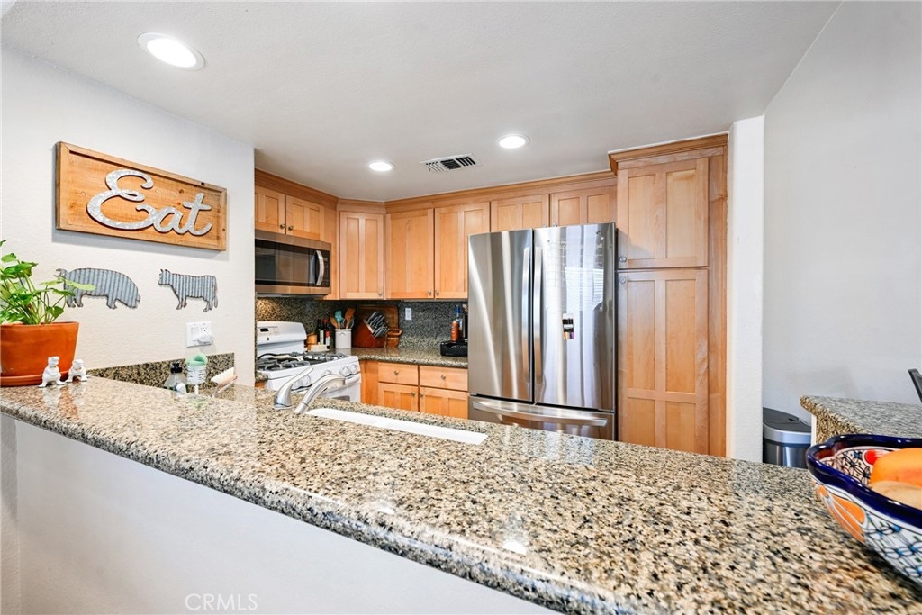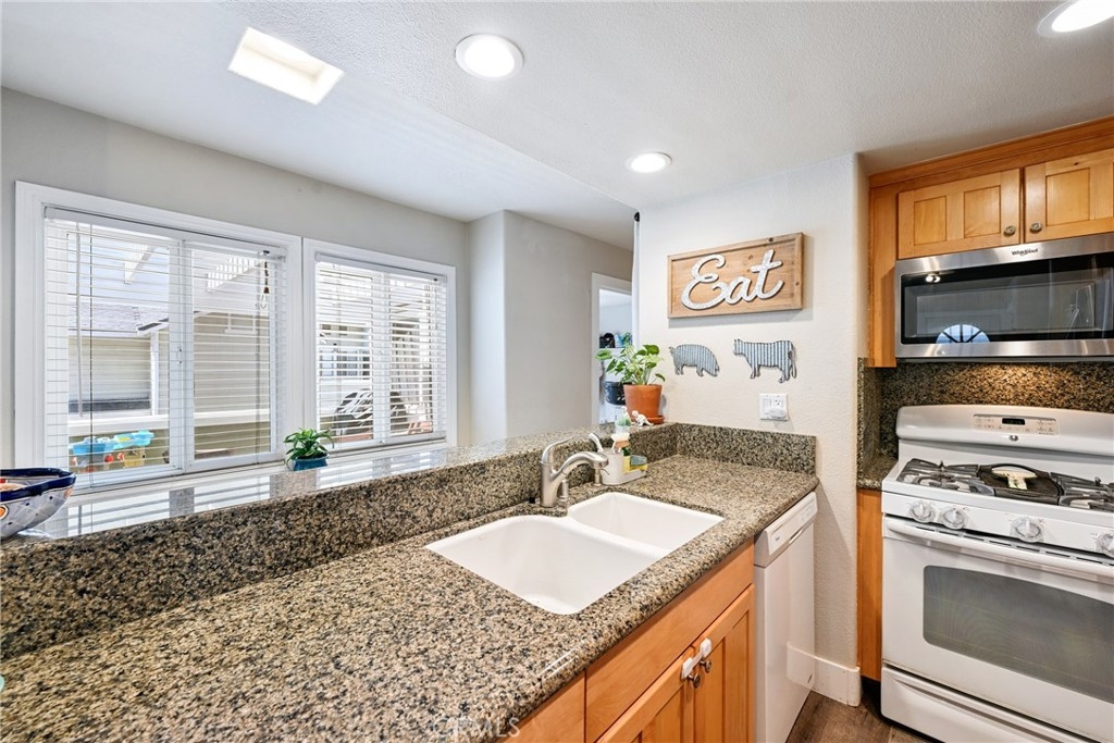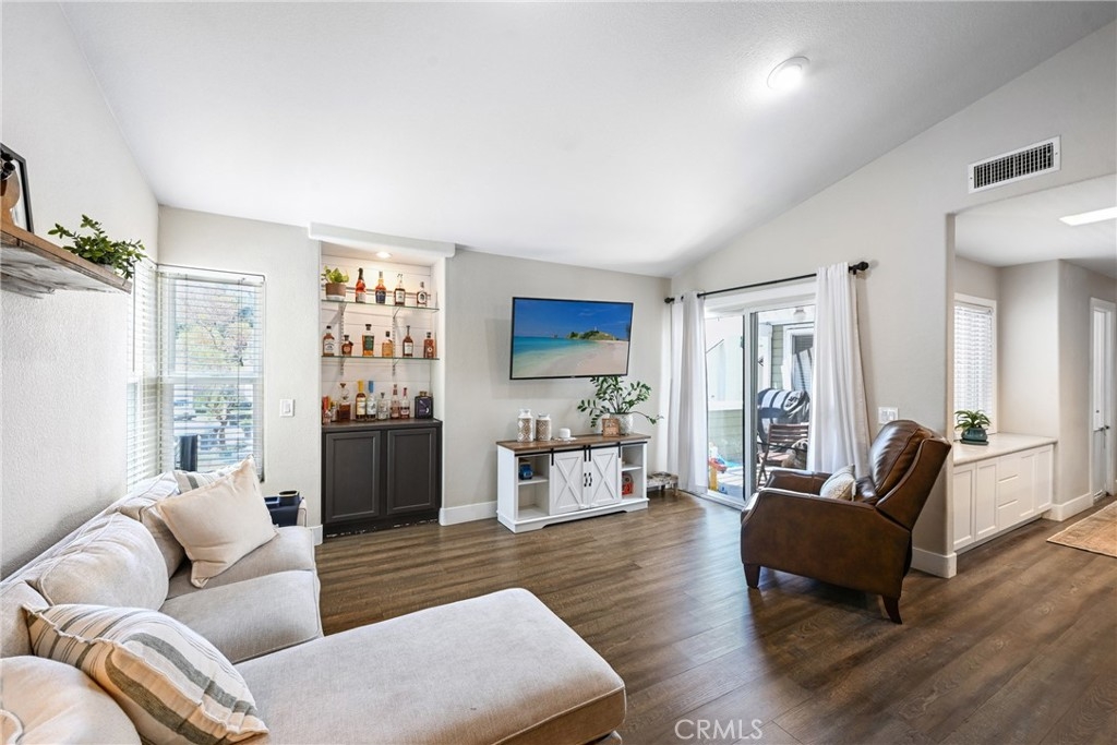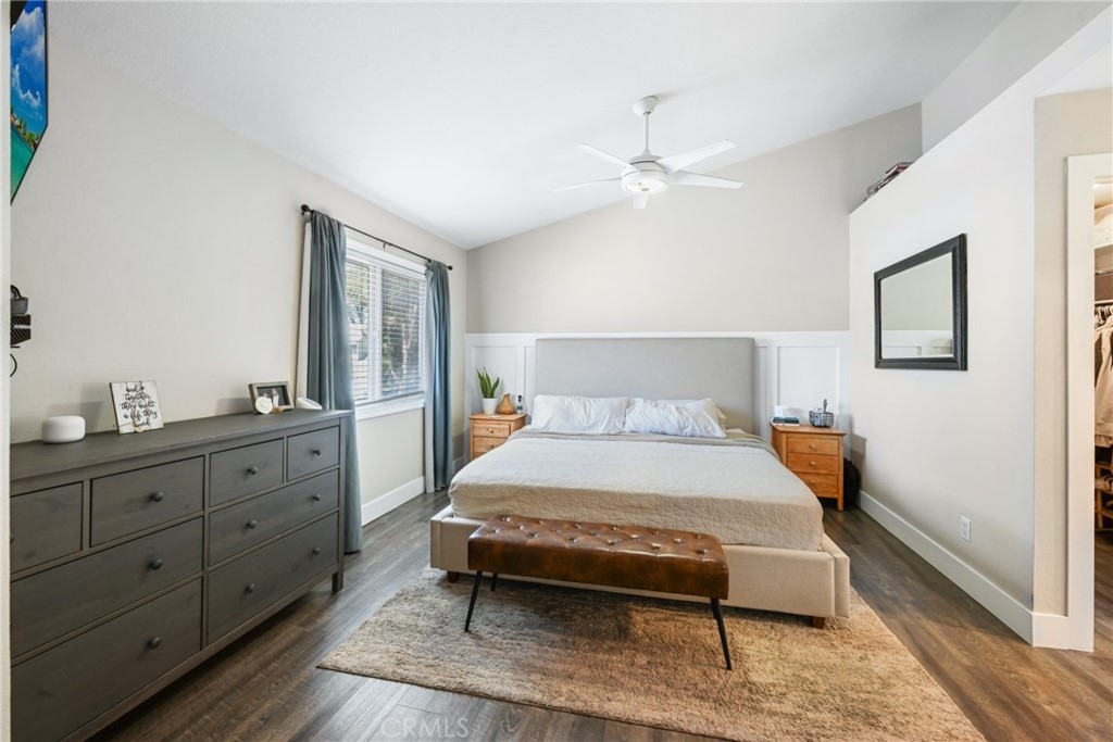 Discover the perfect blend of style and convenience in this second-floor condo at 23395 Camden Court #161, Yorba Linda. This inviting home offers a comfortable and a modern 1,013 square foot living space including 2 bedrooms and 2 bathrooms, ideal for individuals or couples seeking a low-maintenance lifestyle. Enter through a single door with glass accents, leading you into a welcoming interior. The spacious family room features luxury vinyl plank flooring, recessed lighting, a built-in bar, and vaulted ceilings with a ceiling fan, creating a versatile space for relaxation and entertainment. The well-appointed kitchen boasts granite countertops, custom cabinetry, and stainless steel appliances, including a built-in microwave and a 4 gas burner stovetop. A convenient hallway offers built-in storage along with laundry facilities. The primary bedroom is a serene retreat with vaulted ceilings, a ceiling fan, blinds, and drapes. The en-suite bathroom features a walk-in closet and a cultured marble vanity with newer fixtures and a large shower. The second bedroom is equally comfortable with recessed lighting, a ceiling fan, blinds, and drapes, while the hall bathroom offers tile flooring and a convenient shower/tub combination. Enjoy the convenience of a two-car attached garage. Step outside to your private upstairs patio, perfect for morning coffee or evening relaxation. This condo is part of a vibrant community offering a pool, spa, beach volleyball court, and dog park. Experience the best of Yorba Linda living in this modern and well-maintained condo.