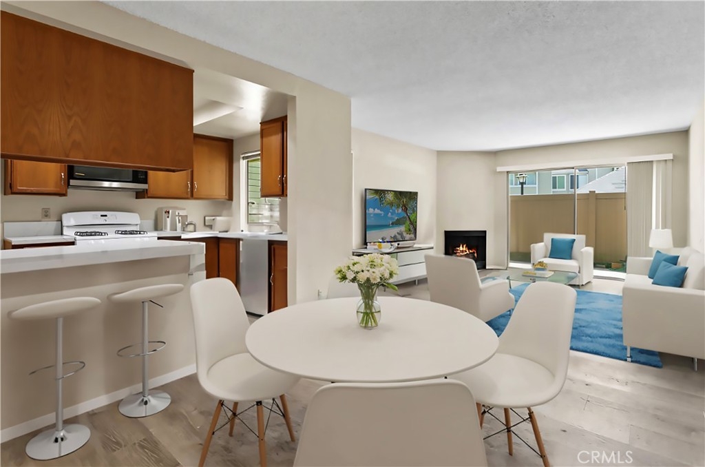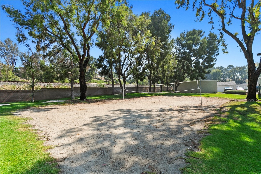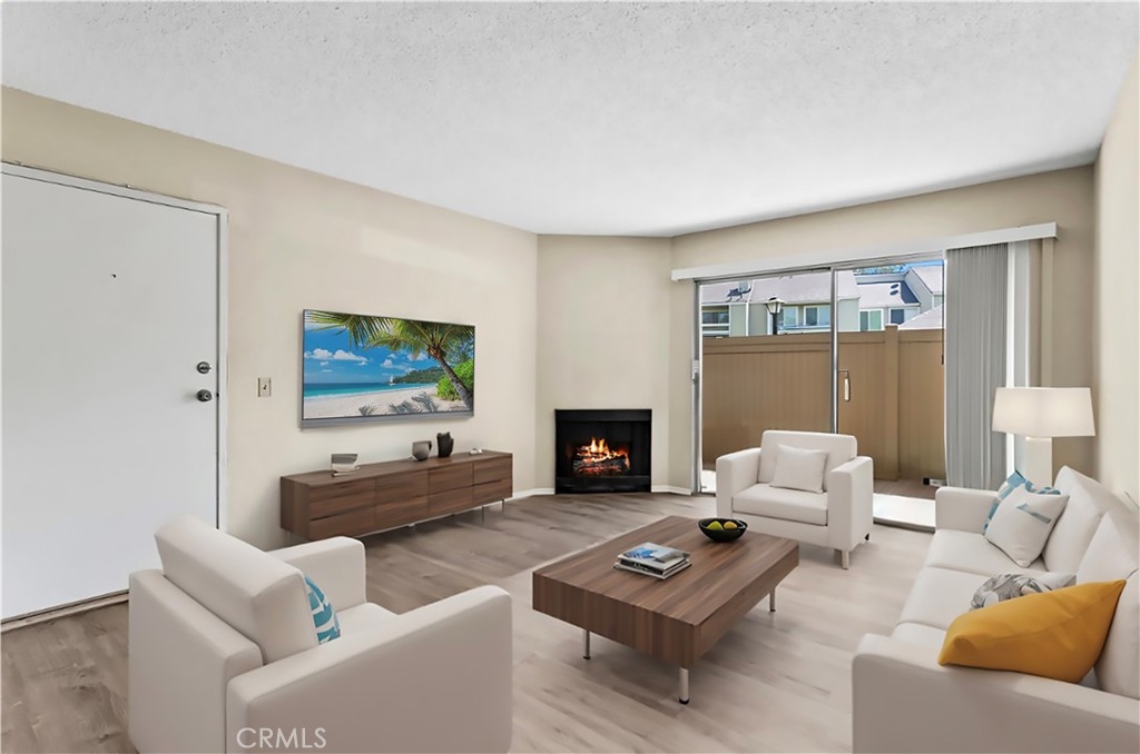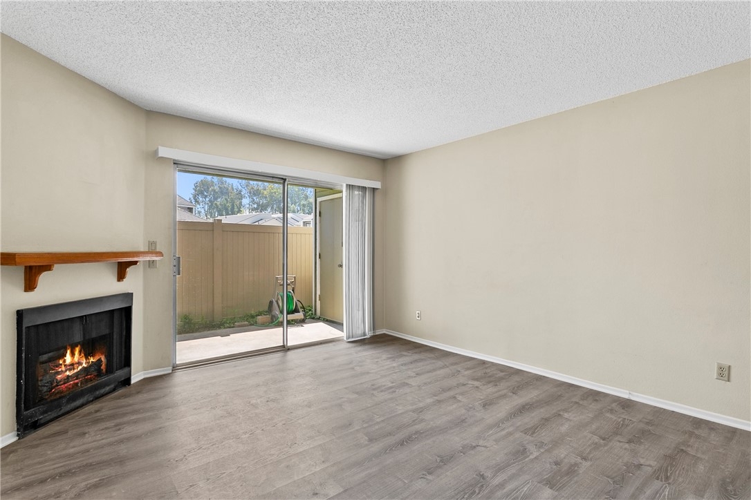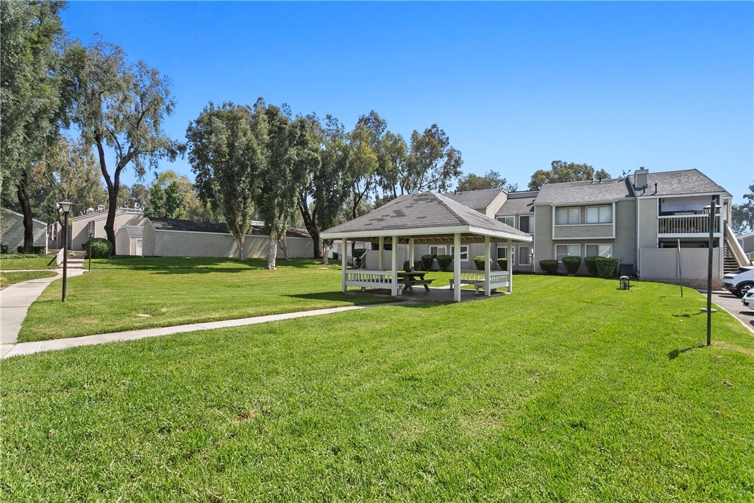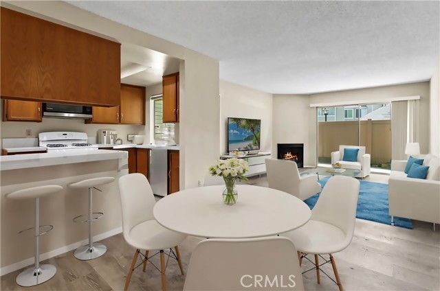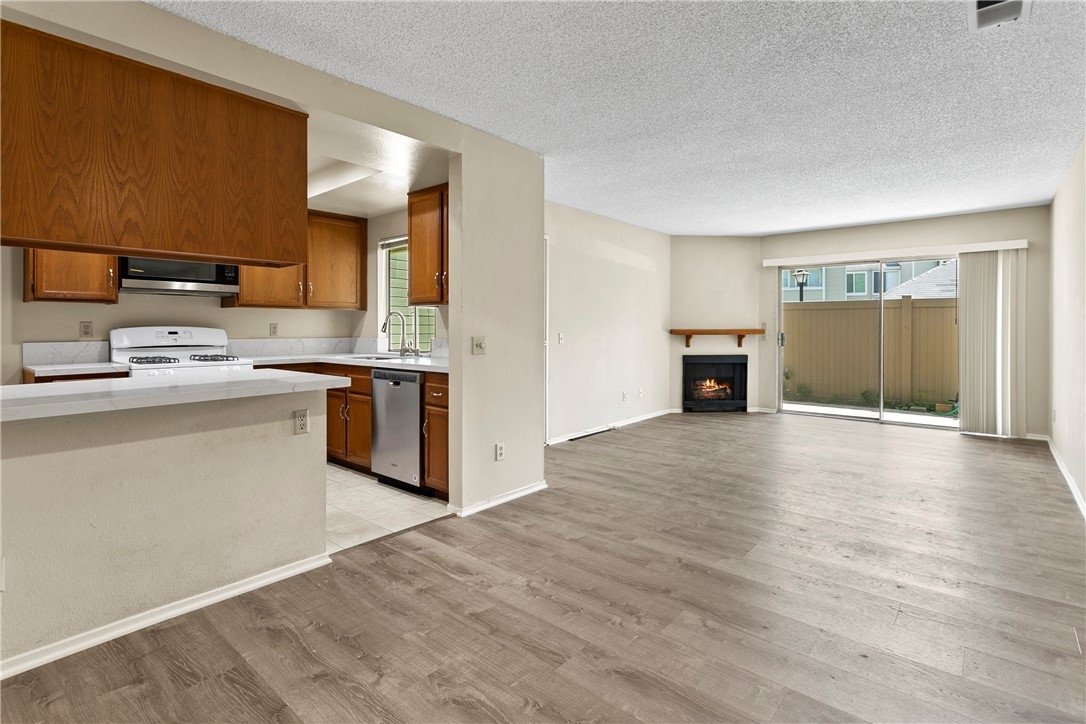 Welcome to 23407 Cambridge Road #188, a charming single-story bottom level condominium that offers both comfort and convenience. As you step through the front door, you are greeted by a cozy living room featuring a gas log fireplace, perfect for relaxing evenings. To your right, you'll find a modern kitchen adorned with quartz counter tops, seamlessly connecting to a bright breakfast nook where you can enjoy casual meals. Down the hall, the secondary bedroom offers privacy and comfort, while directly across from it, the secondary full bathroom provides convenience for guests or family members. Further down the hall lies the spacious primary suite, complete with an attached full bathroom for added comfort and privacy.This corner end unit offers easy access through either the front door or the two-car attached garage, providing direct entry into the property. Outside, a greenbelt awaits through the front door, featuring BBQ areas and a charming gazebo, perfect for outdoor gatherings. Residents of this community enjoy access to a variety of amenities through the HOA, including a pool and spa for relaxation, a clubhouse for social events, volleyball courts for recreation, and a children's playground for family enjoyment. The HOA also covers essential services such as water, trash removal, and all exterior maintenance, ensuring a hassle-free living experience. Additionally, landscaping throughout the property is maintained by the HOA, contributing to a well-kept environment. Nature enthusiasts will appreciate the nearby hiking and biking trails, offering opportunities to explore the surrounding areas. Located conveniently close to Savi Ranch shopping center, residents have easy access to dining options, freeways, and toll roads, enhancing the convenience of daily life.
