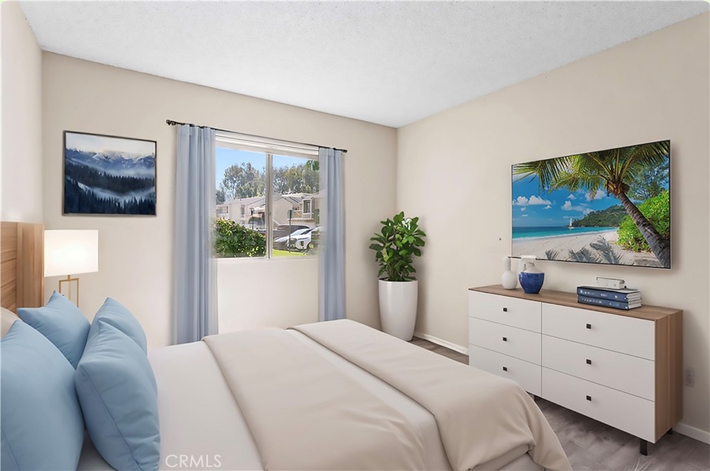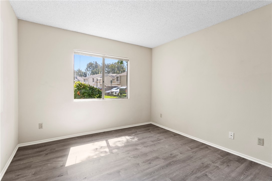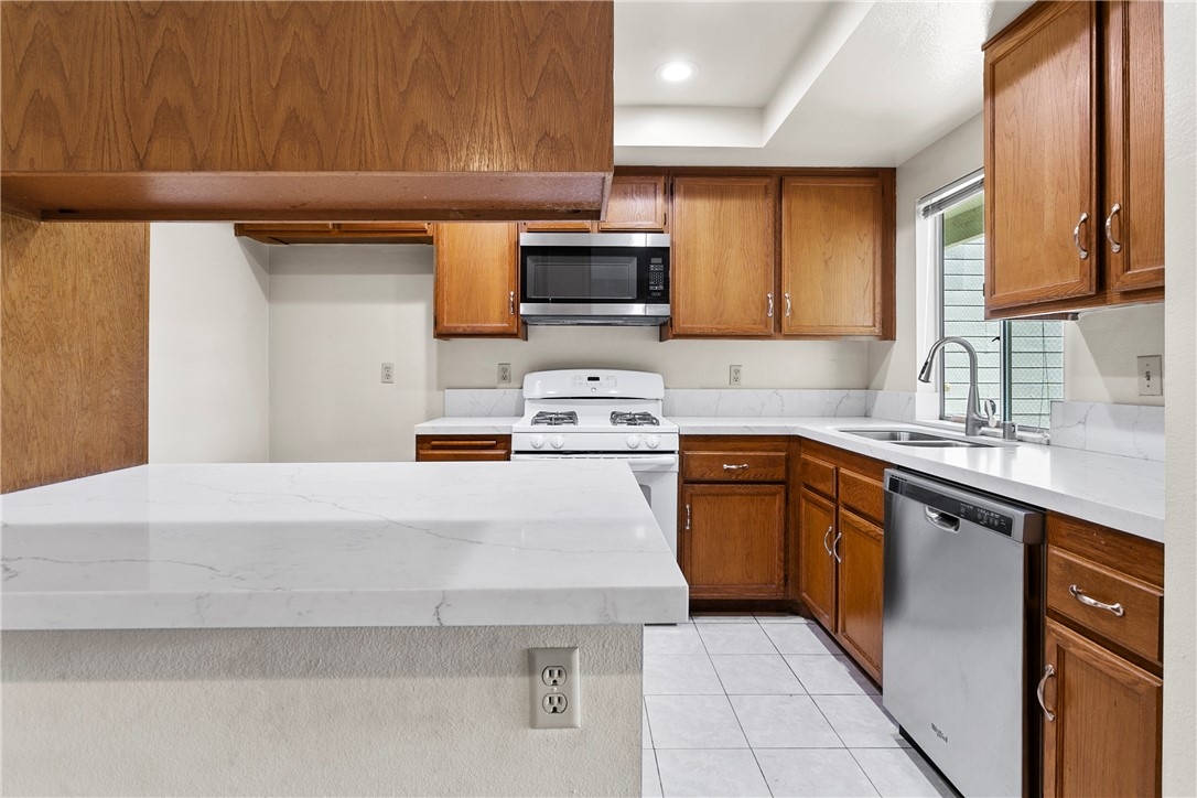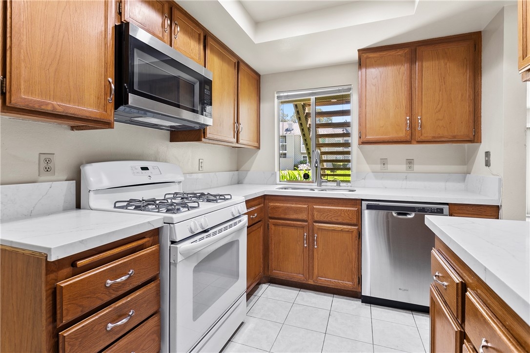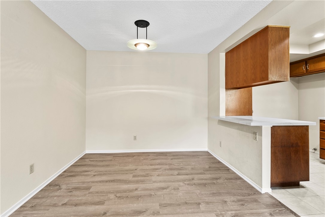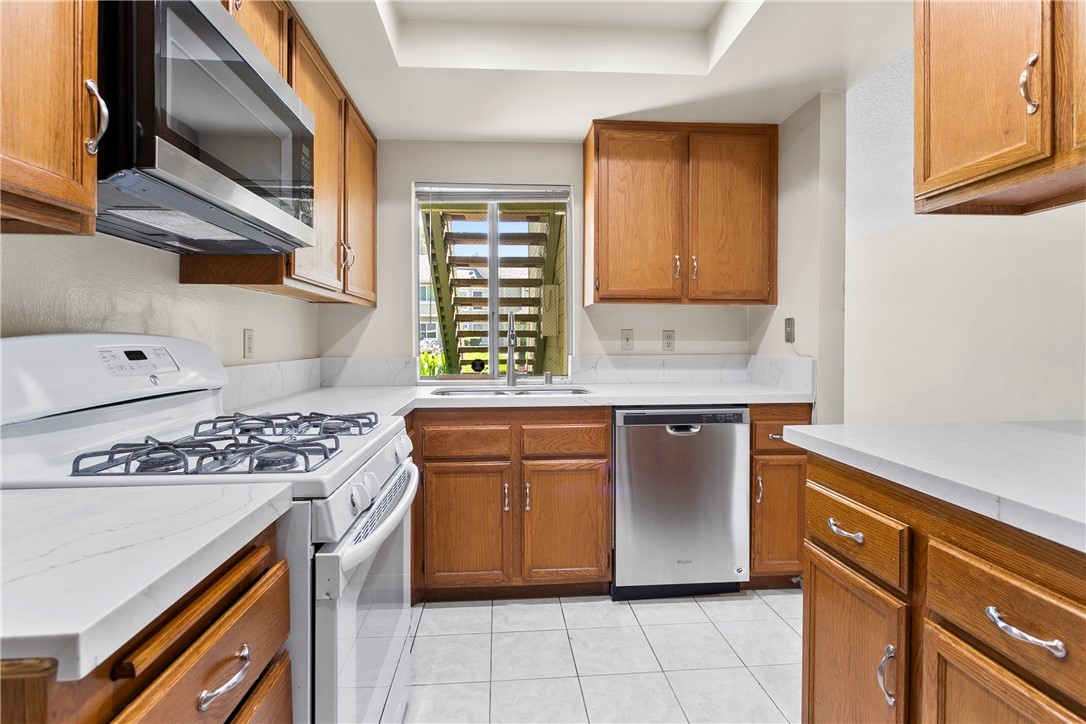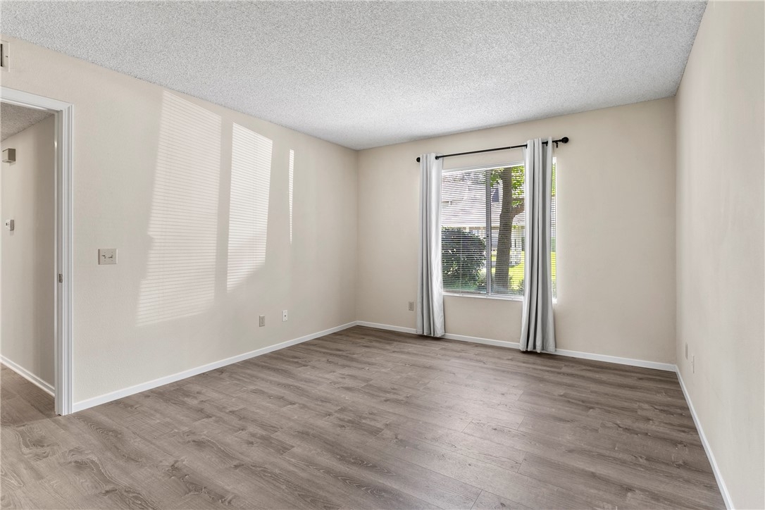 Welcome to 23407 Cambridge Road #188, a charming single-story bottom level condominium that offers both comfort and convenience. As you step through the front door, you are greeted by a cozy living room featuring a gas log fireplace, perfect for relaxing evenings. To your right, you'll find a modern kitchen adorned with quartz counter tops, seamlessly connecting to a bright breakfast nook where you can enjoy casual meals. Down the hall, the secondary bedroom offers privacy and comfort, while directly across from it, the secondary full bathroom provides convenience for guests or family members. Further down the hall lies the spacious primary suite, complete with an attached full bathroom for added comfort and privacy.This corner end unit offers easy access through either the front door or the two-car attached garage, providing direct entry into the property. Outside, a greenbelt awaits through the front door, featuring BBQ areas and a charming gazebo, perfect for outdoor gatherings. Residents of this community enjoy access to a variety of amenities through the HOA, including a pool and spa for relaxation, a clubhouse for social events, volleyball courts for recreation, and a children's playground for family enjoyment. The HOA also covers essential services such as water, trash removal, and all exterior maintenance, ensuring a hassle-free living experience. Additionally, landscaping throughout the property is maintained by the HOA, contributing to a well-kept environment. Nature enthusiasts will appreciate the nearby hiking and biking trails, offering opportunities to explore the surrounding areas. Located conveniently close to Savi Ranch shopping center, residents have easy access to dining options, freeways, and toll roads, enhancing the convenience of daily life.
