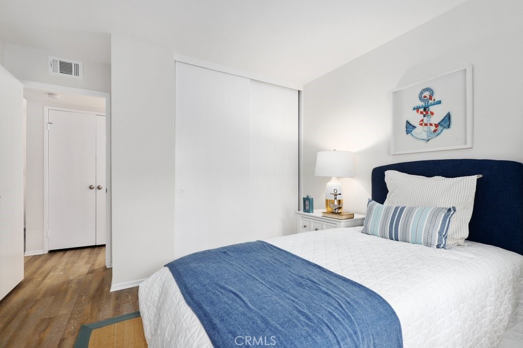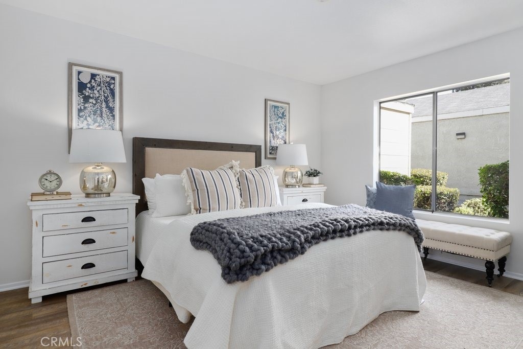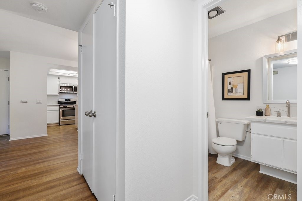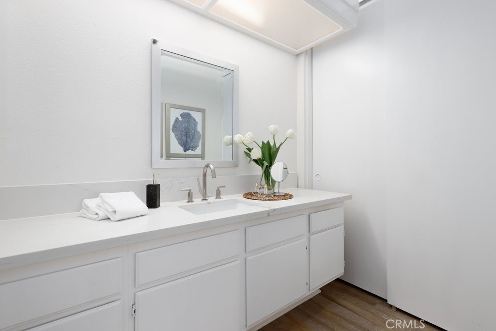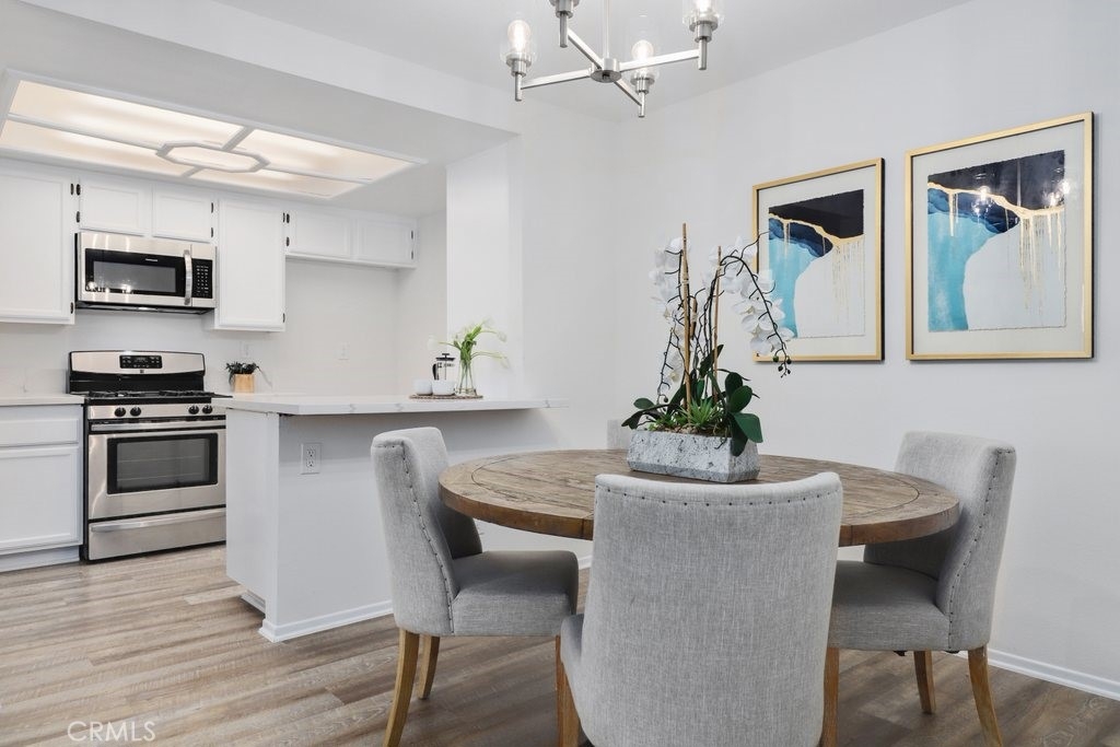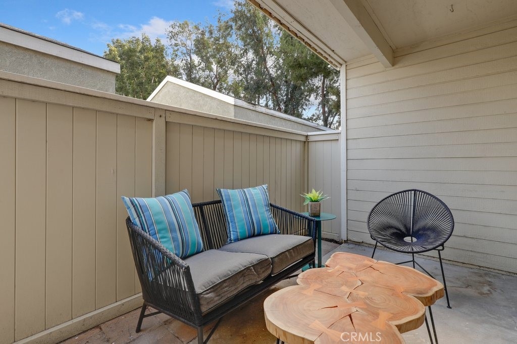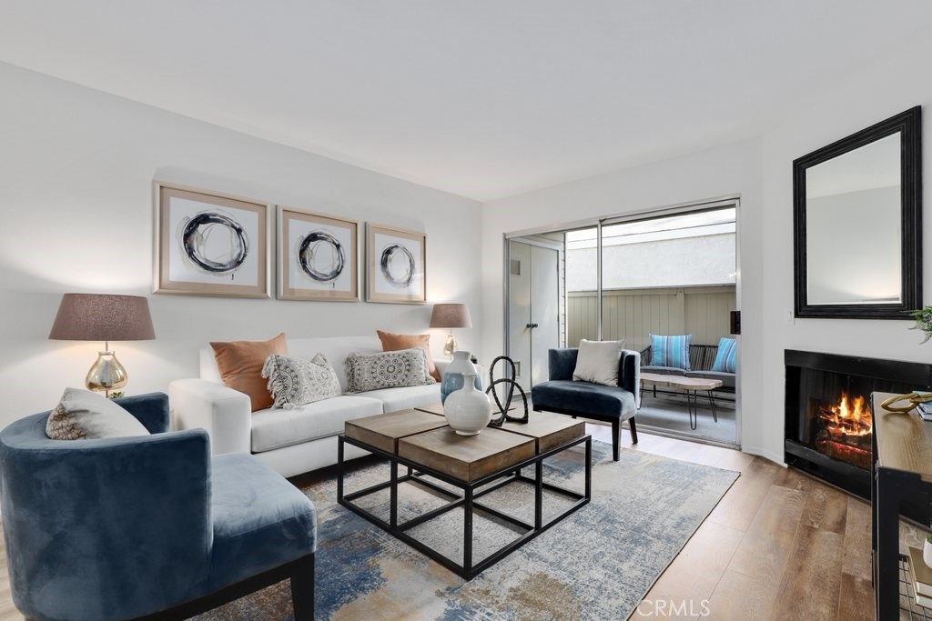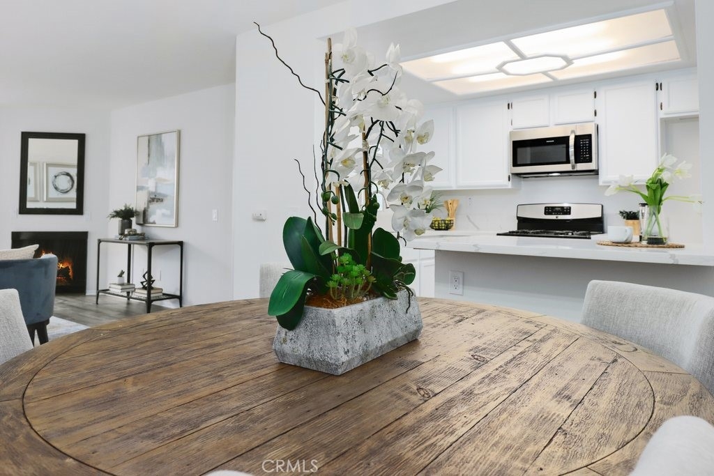 Completely remodeled, this ground-level Yorba Linda Villages condo is truly turn-key! Warm luxury laminate plank floors and fresh paint throughout complement the bright and open floorplan. Enter into the inviting living room featuring a cozy fireplace and sliding doors to a spacious and private patio. The living room seamlessly flows to the dining area and to the kitchen. The completely remodeled kitchen is well-appointed with fresh white cabinets, quartz counters and stainless steel appliances. Down the hall, the primary bedroom offers an en-suite primary bathroom with a quartz-topped vanity and a walk-in shower. The secondary bedroom is generously sized and adjacent to the full hall bathroom with a new quartz-topped vanity. Enjoy the nearby community pool, spa, clubhouse, BBQ area and playground, and award-winning Placentia-Yorba Linda Unified schools.