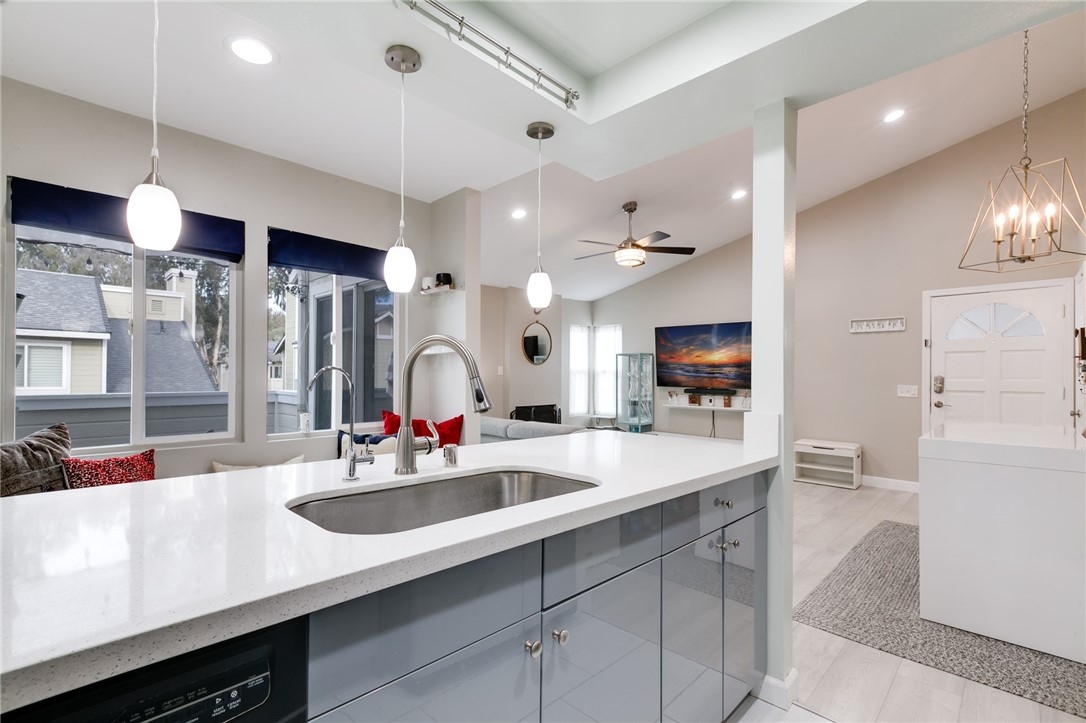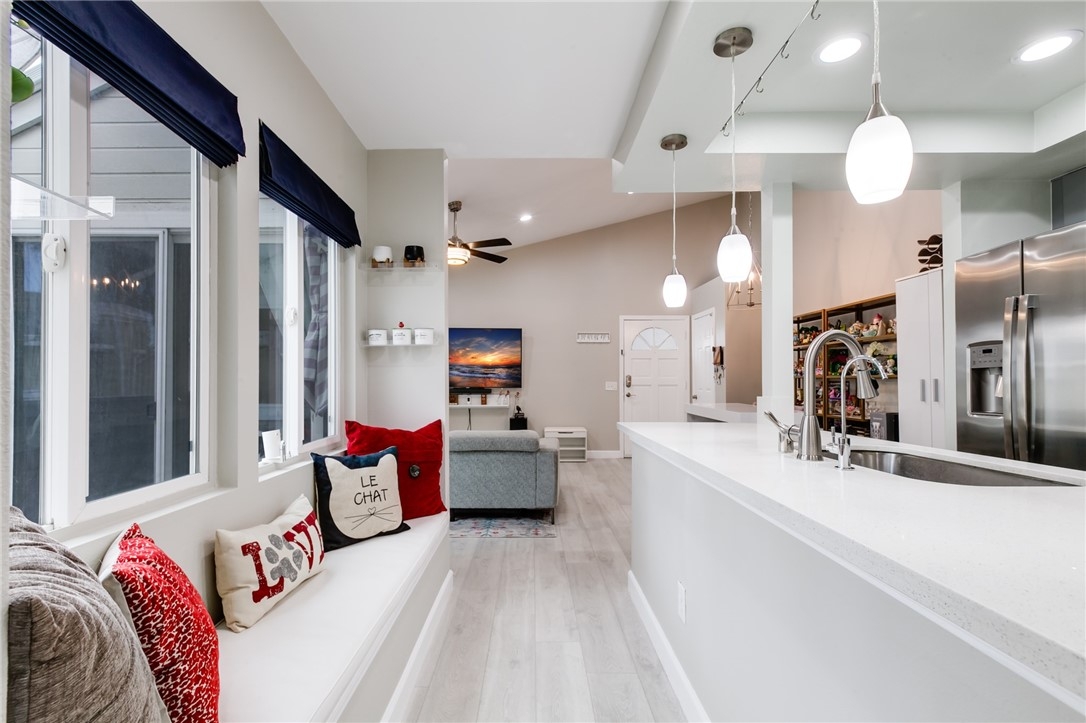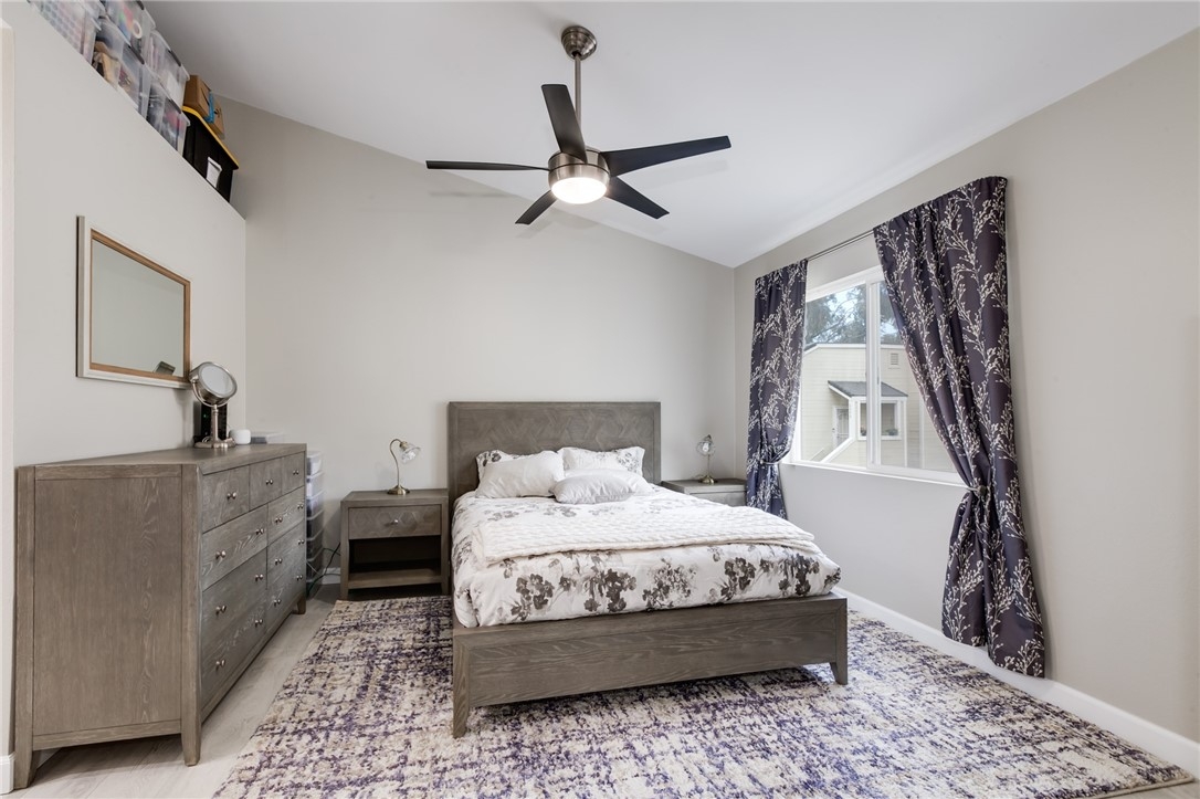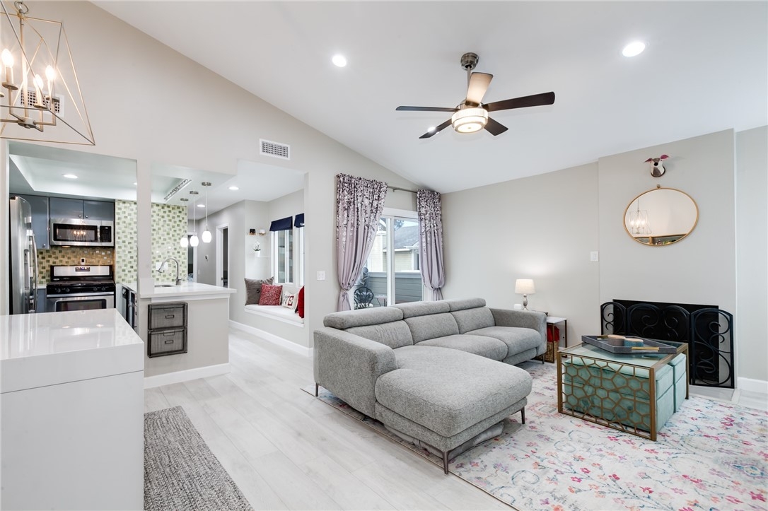 Charming, upgraded townhome features amazing open floor plan and high vaulted ceilings. Kitchen nicely updated with quartz countertops, designer cabinets, decorative backsplash and stainless-steel appliances. Inviting family room features cozy fireplace, ceiling fan and opens to private patio. Spacious master bedroom connects to an upgraded en suite bathroom featuring modern dual sink vanity, quartz countertop and a luxurious rainfall shower head system. Additional features include upgraded laminate flooring, designed tiles, recessed lights throughout, ceiling fans in both bedrooms, dual pane windows and slider, newer HVAC, etc. The Village community features parks, pool, spa, BBQ pits and green-ways.