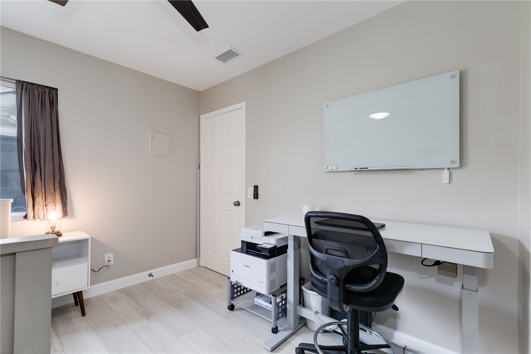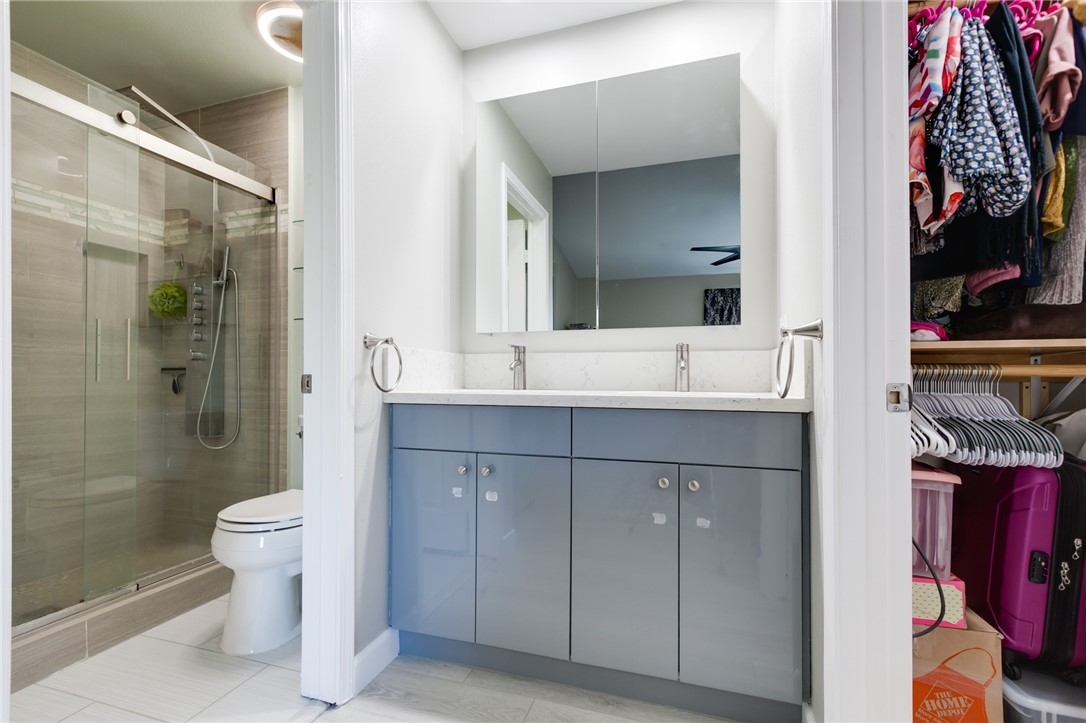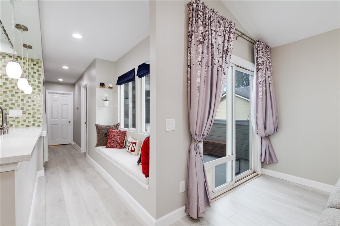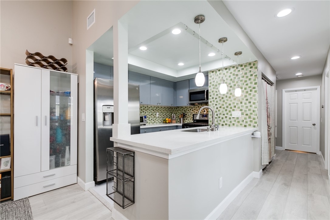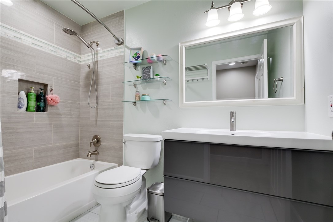 Charming, upgraded townhome features amazing open floor plan and high vaulted ceilings. Kitchen nicely updated with quartz countertops, designer cabinets, decorative backsplash and stainless-steel appliances. Inviting family room features cozy fireplace, ceiling fan and opens to private patio. Spacious master bedroom connects to an upgraded en suite bathroom featuring modern dual sink vanity, quartz countertop and a luxurious rainfall shower head system. Additional features include upgraded laminate flooring, designed tiles, recessed lights throughout, ceiling fans in both bedrooms, dual pane windows and slider, newer HVAC, etc. The Village community features parks, pool, spa, BBQ pits and green-ways.