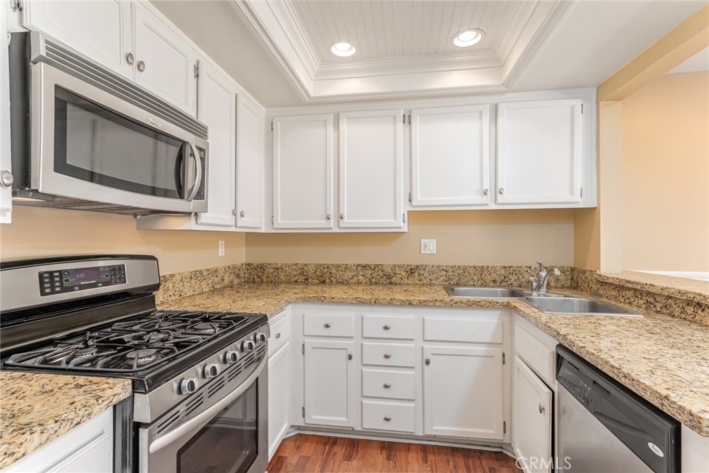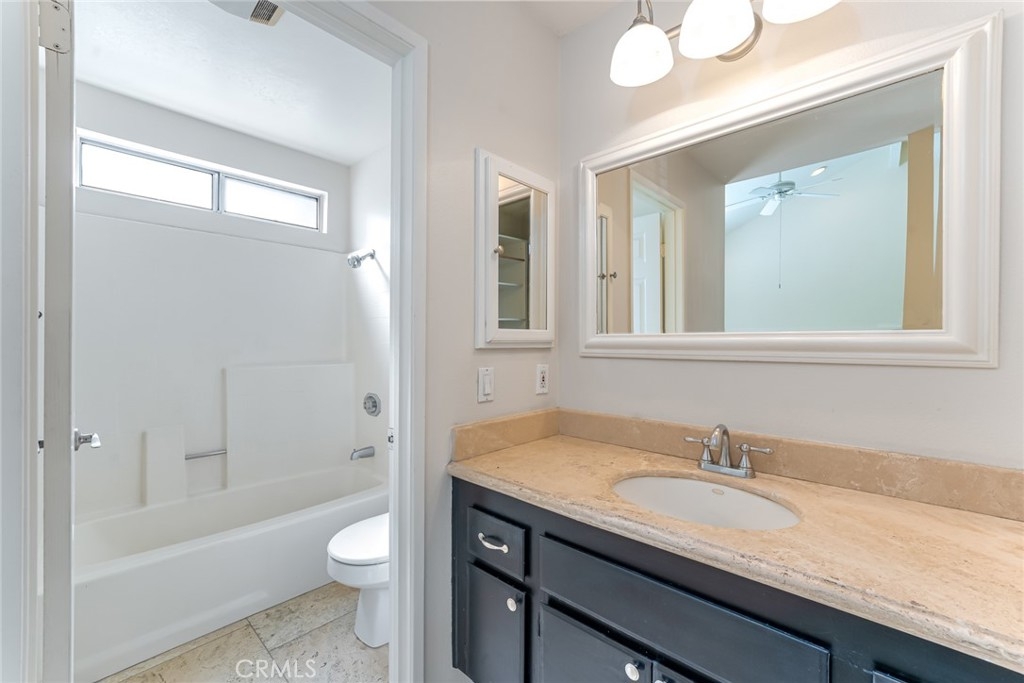 Beautiful end unit Townhome located in the Yorba Linda Villages and Yorba Linda High School boundary. This ideal floor plan features two master bedrooms, each with their own bathroom, and a third bathroom downstairs. High beamed ceiling in the master suite with ceiling fan, mirrored wardrobe doors, and built in closet storage. Elegant stone tile flooring in the bathroom with a shower/tub. The second bedroom has wainscoting accents, ceiling fan, mirrored wardrobe with shelving, and tile flooring in the bathroom with a shower/tub. High ceilings in the entry and living area, gorgeous flooring throughout the main floor with a fireplace located in the living room. Beautiful granite kitchen with bar top seating, dual stainless steel sinks, and plenty of cabinet space. Recessed lighting throughout makes this inviting and welcoming. Private fenced patio with direct access from the house. Two car attached garage with direct access, laundry hookups, and storage space. This highly desirable park like community offers a community pool, spa, bbq area, playground, clubhouse, and is minutes from the Santa Ana River Trail for all your cycling, running, and walking activities.