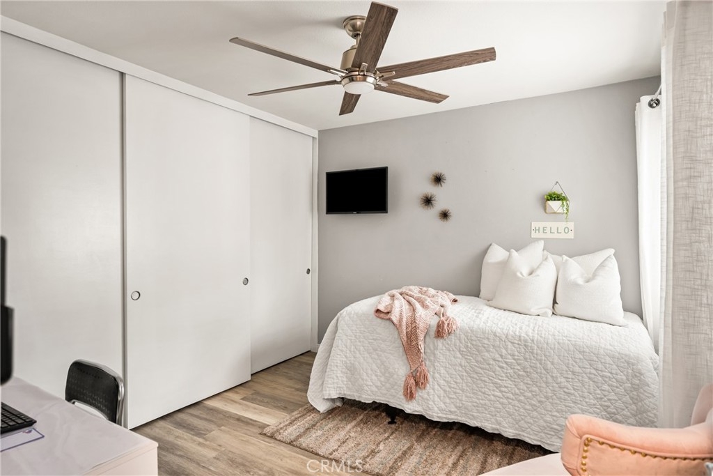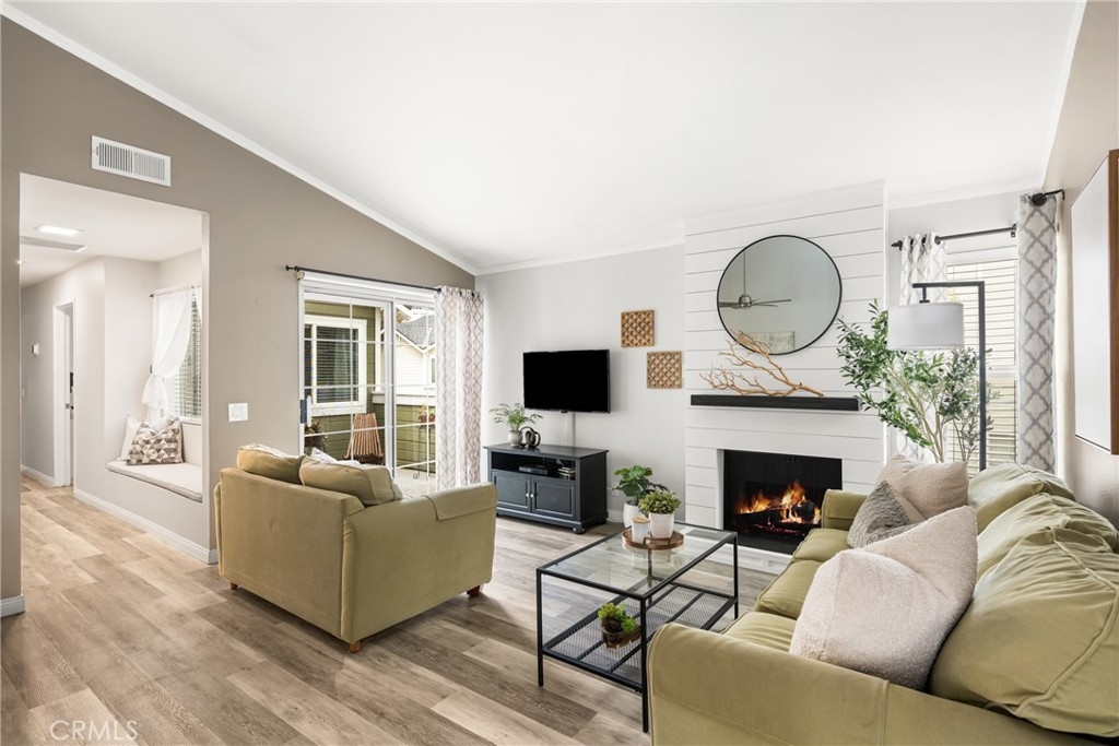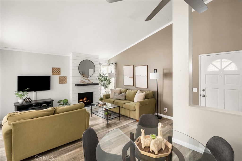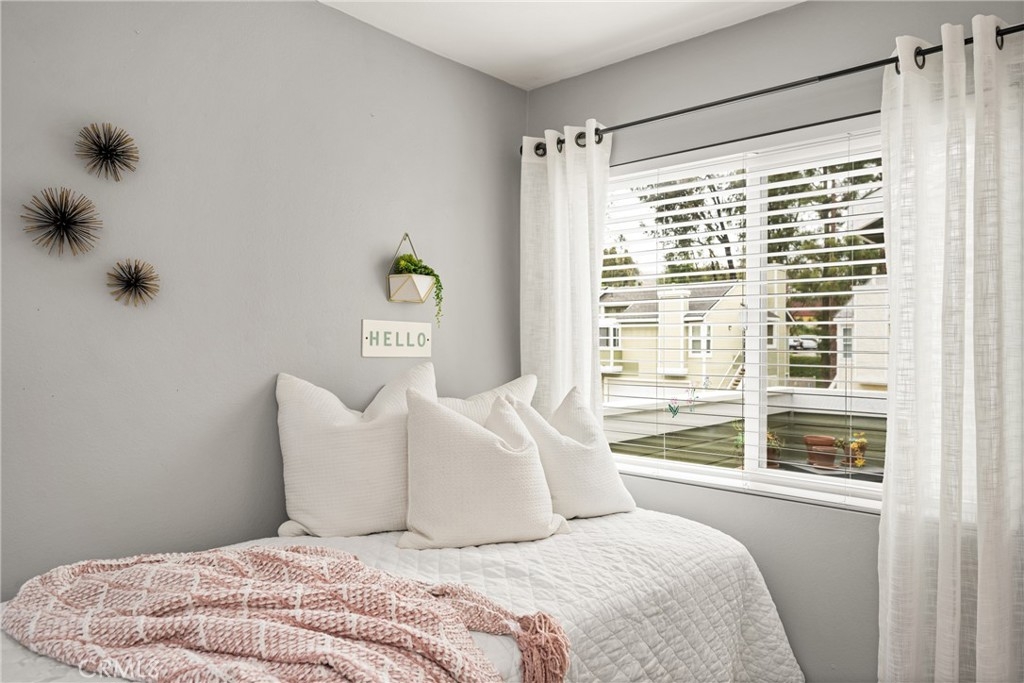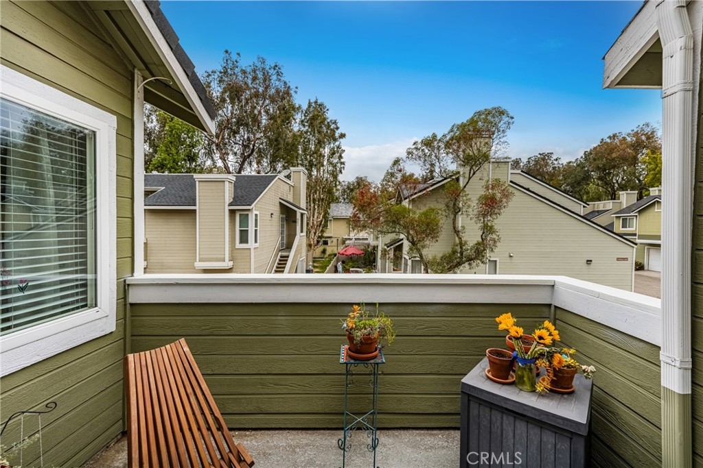 Tucked away in the peaceful canyons and surrounded by lush trees, this beautiful upstairs, renovated 2-bedroom, 2 bathroom condo in Yorba Linda Villages offers the perfect mix of modern comfort. This spacious layout, is an end unit that let's in tons of light and creates a brite and airy vibe! The remodeled kitchen has a newer gas stove and microwave, pull out drawers in the cabinets with an opening to enjoy a view of your patio balcony. From your living room step out to your private patio balcony to relax and enjoy the fresh air and sunshine. The living room has a cozy gas fireplace, crown moldings and custom paint. Heading down the hallway is a very cute window seating area to again, enjoy the patio balcony. The first bedroom boasts a 3 door oversized closet, window blinds, ceiling fan and laminate flooring. The hall bath has a tub/shower and has been remodeled. The large primary bedroom with crown molding, custom shutters, ceiling fan, laminate flooring and a large walk in closet. The primary bathroom remodeled with a separate toilet room and a large walk in shower. The home has been updated with style and thoughtfulness to ensure a comfortable living space. In this quite community you can enjoy the sparkling pool, spa, clubhouse and tot lot area. Located next to walking trails, Santa Ana River Trail for biking and walking. Yorba Linda award winning school district. Plus, a detached 2-car garage with plenty of storage cabinets and parking. This condo is the ideal retreat for anyone looking to enjoy a peaceful lifestyle with easy access to nature and all the comforts of modern living!