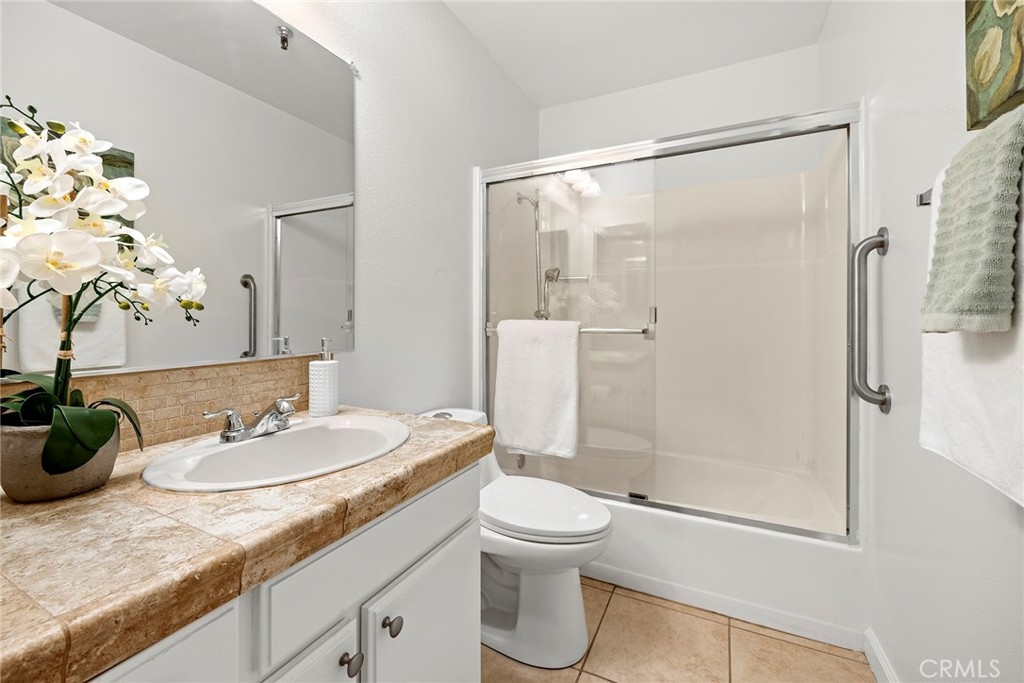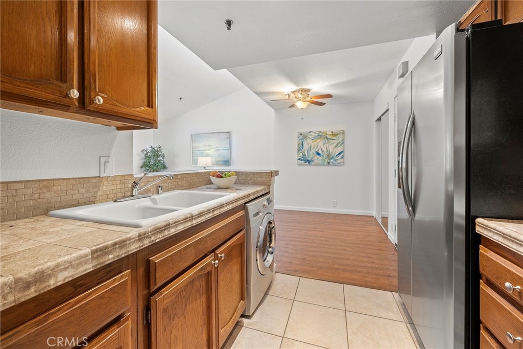 Welcome to this beautifully maintained upper end-unit nestled in a lushly landscaped, gated 55+ community. Enjoy serene greenbelt views from your spacious private balcony. Inside, the bright and airy living area features soaring cathedral ceilings with high accent windows that let in an abundance of natural light. The open-concept layout includes a dining area with a handy storage closet or pantry, and a well-equipped kitchen featuring a gas range, built-in microwave, refrigerator, and even a Samsung all-in-one washer/dryer combo—perfect for everyday laundry needs. For larger loads, a shared laundry room is conveniently located just one floor below. The inviting bedroom offers direct access to the balcony through a sliding glass door, along with both a walk-in and wardrobe closet for ample storage. The full bathroom includes built-in linen storage for added convenience. Community amenities include a spacious recreation room complete with a full kitchen, cozy fireplace, card tables, and a peaceful reading lounge. Residents also enjoy regular social events like monthly potlucks—fostering a warm, friendly atmosphere. Located just across the street from the vibrant Yorba Linda Town Center, you'll have easy access to shopping, dining, entertainment and a local coffee shop are just down the road. This isn’t just a place to live—it’s a great community to be part of. Come take a look and see if it feels like home!