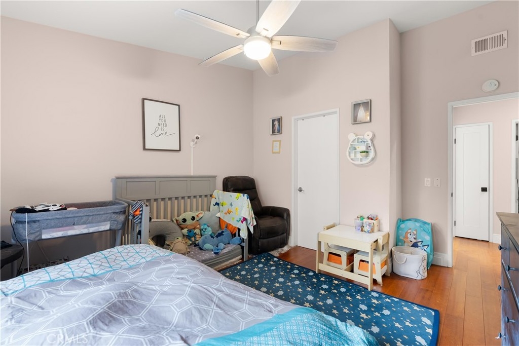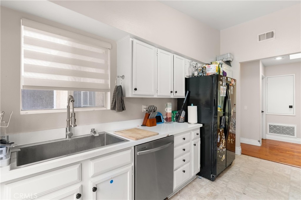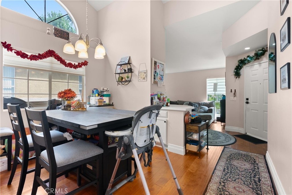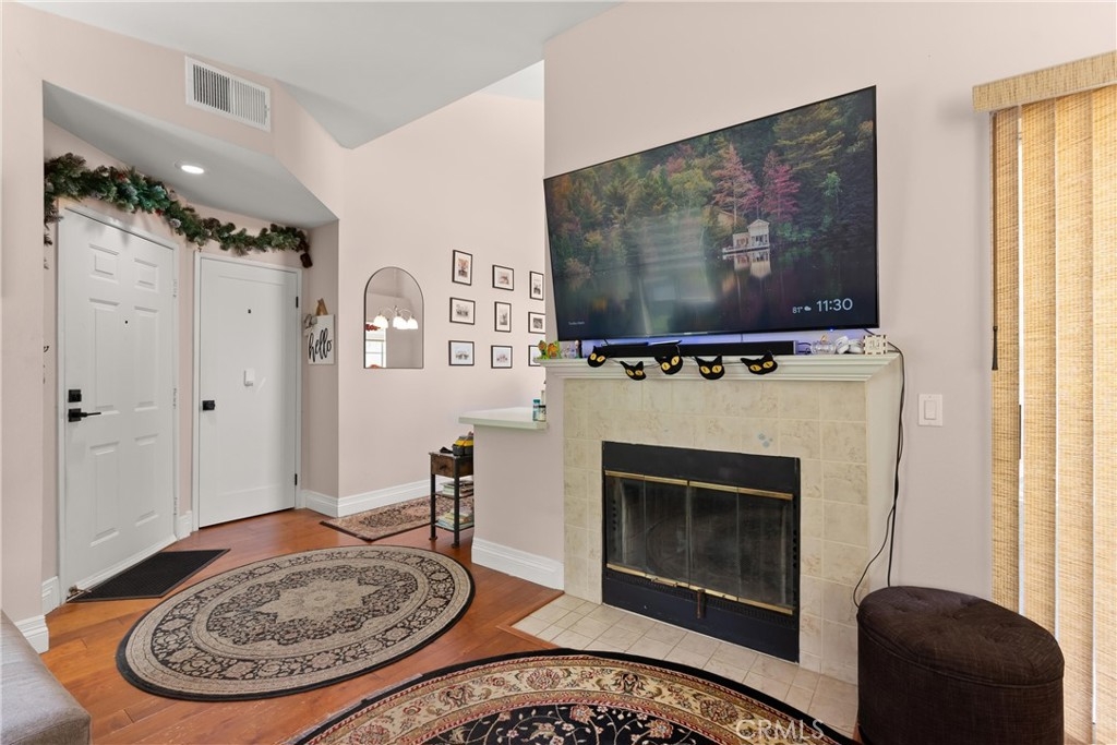 Welcome to coveted, The Hills Community. This spacious upstairs end-unit offers over 1,200 SQFT of comfortable living with 2 bedrooms and 2 baths. Beautiful engineered hardwood floors extend from the entry into the living and dining rooms as well as both bedrooms. It exhibits high ceilings and no one above. The large living room is filled with natural light and features a cozy gas fireplace and sliding glass doors that open to a private balcony. A versatile formal dining area serve as a home office or playroom. A well-appointed kitchen is equipped with stainless steel appliances, abundant cabinet & counter space, and a breakfast nook, with direct access to the balcony. Boasting high-sloped ceilings with a skylight, the primary suite is sure enlighten the senses. Its dressing area is adjacent to the walk-in closet, and a refreshed bathroom with a brand-new vanity, marble countertop, and modern faucet. The second bedroom is generously sized and also includes its own walk-in closet. A full-size shower completes the hallway guest bathroom. Additional highlights include an indoor laundry room conveniently located near the bedrooms (with extra storage space and a water heater) plus an exterior storage closet near the front entry. Vertical blinds can be found throughout and as well as ceiling fans in the bedrooms for added comfort and functionality. Residents of The Hills enjoy resort-style amenities including 2 pools, 3 spas, tennis courts, a fitness center, clubhouse, and 2 playgrounds. Conveniently located near SAVI Ranch shopping, dining, the 91 freeway, and the 241 toll road, and award winning schools.