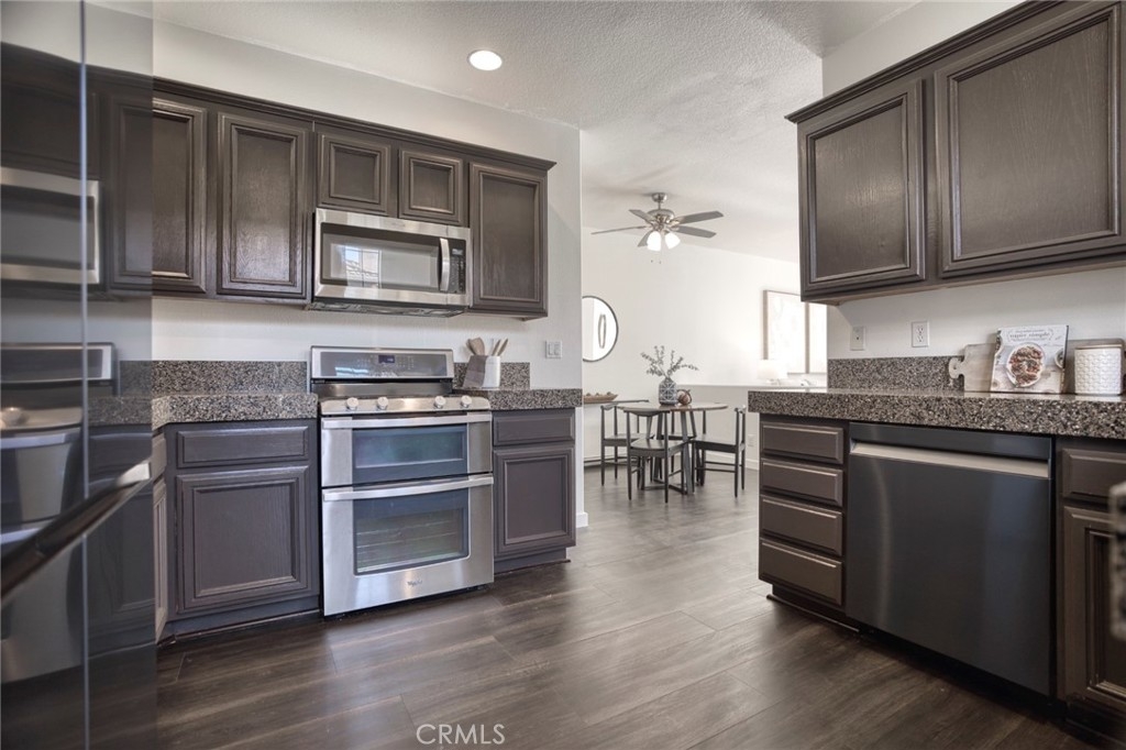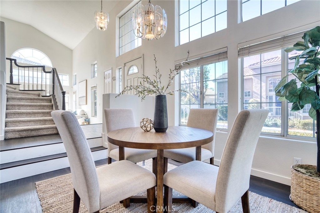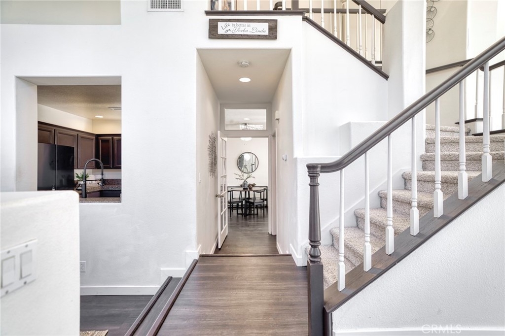 Sitting above the hustle and bustle of everyday life is 5440 Ryan Drive, part of Yorba Linda’s picturesque La Terraza condo community and offered at an exceptional value within this desirable neighborhood. This Mediterranean-style residence offers three bedrooms and two bathrooms upstairs, with a powder room downstairs for ease of living and convenience alike. Just off the elevated entry, with steps down to dining, kitchen, and a welcoming sitting room is the home’s main gathering space – an open floorplan effortlessly joins the eating and entertainment areas into one. A glass slider leads to the backyard, a manageable space wonderful for small gatherings or quiet time alone. Back inside, the kitchen's granite countertops and modern appliances lead to the dining room; ebony-toned floors on the main level and espresso-hued cabinets are balanced by light walls and ample sunlight bathing the interior of the unit, thanks to the property’s many windows. A sweeping staircase leads to an upstairs landing, two smaller bedrooms, and an adjacent full bathroom, while the primary suite with its double sink vanity, separate tub, shower, and private commode provides a serene space to enjoy at day’s end. An attached, direct-access garage, inside laundry, fireplace, and a location close to community amenities round out this home’s features. Just steps from Bryant Ranch Park and set in a location full of rich history, 5440 Ryan Drive is a treasure in the hills of Yorba Linda.