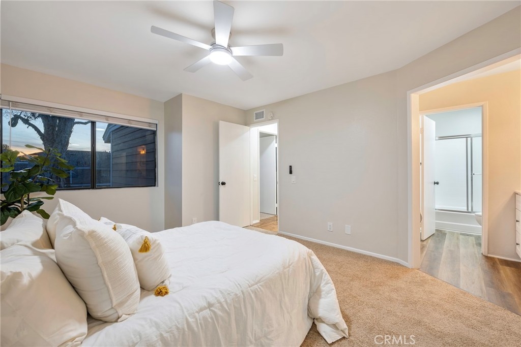 Welcome to 6084 Terrace Lane #132, Yorba Linda! Located in the desirable Kellogg Terrace community, this well situated upper, end-unit offers 3 bedrooms and 2 bathrooms with a bright, open layout. The spacious living room features vaulted ceilings and a cozy fireplace, creating a comfortable space to relax or entertain. The dining area flows easily into the kitchen, which includes crisp white shaker cabinetry and new hardware. The primary bedroom includes mirrored closets and a private en-suite bath with new vinyl plank flooring. Two additional bedrooms are generously sized and ideal for family, guests, or a home office. A second full bathroom includes a tub/shower combination as well as updated fixtures and flooring. The home has been painted throughout, new carpet installed in the bedrooms and vinyl plank in the bathrooms. Enjoy your two private balconies overlooking the greenbelt open space and pool. Community amenities include a pool, spa, and beautifully landscaped greenbelts. Conveniently located within the Pla-Yorba Linda School District and near the Home Goods/Trader Joe’s shopping center, dining at the Yorba Linda Town Center and access to major freeways, this home combines comfort, privacy, and a prime Yorba Linda location.